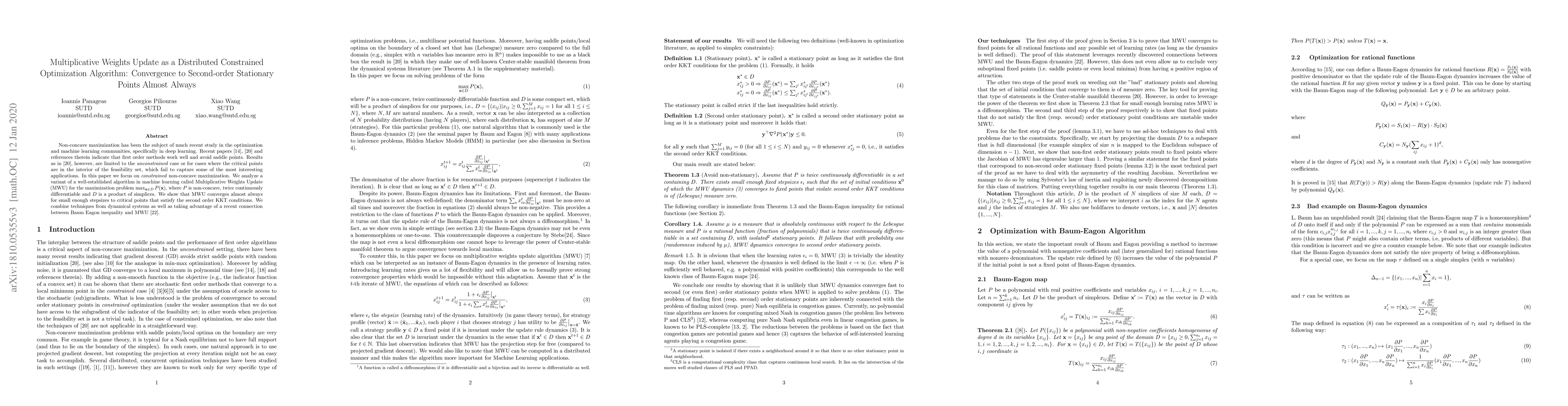 Non-concave maximization has been the subject of much recent study in the optimization and machine learning communities, specifically in deep learning. Recent papers Ge et al, Lee et al (and references therein) indicate that first order methods work well and avoid saddle points. Results as in Lee et al, however, are limited to the \textit{unconstrained} case or for cases where the critical points are in the interior of the feasibility set, which fail to capture some of the most interesting applications. In this paper we focus on \textit{constrained} non-concave maximization. We analyze a variant of a well-established algorithm in machine learning called Multiplicative Weights Update (MWU) for the maximization problem $\max_{\mathbf{x} \in D} P(\mathbf{x})$, where $P$ is non-concave, twice continuously differentiable and $D$ is a product of simplices. We show that MWU converges almost always for small enough stepsizes to critical points that satisfy the second order KKT conditions. We combine techniques from dynamical systems as well as taking advantage of a recent connection between Baum Eagon inequality and MWU (Palaiopanos et al).