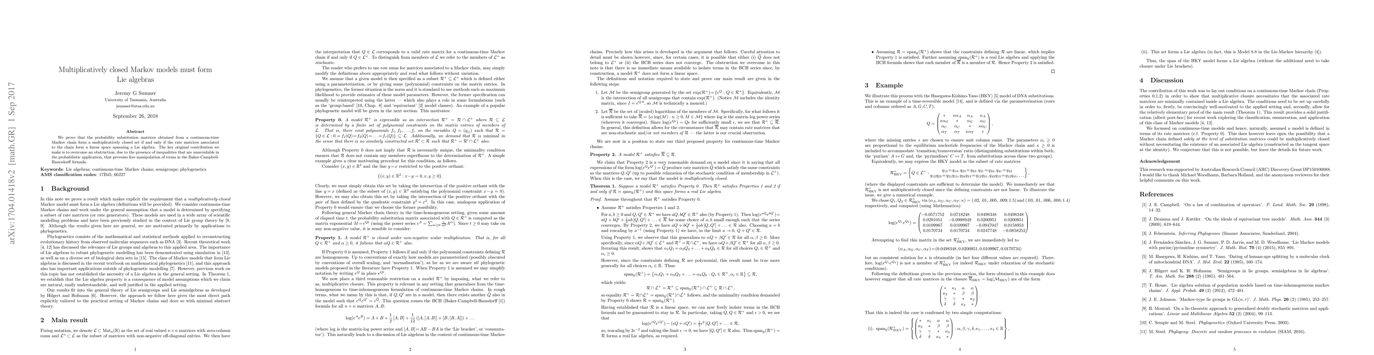 We prove that the probability substitution matrices obtained from a continuous-time Markov chain form a multiplicatively closed set if and only if the rate matrices associated to the chain form a linear space spanning a Lie algebra. The key original contribution we make is to overcome an obstruction, due to the presence of inequalities that are unavoidable in the probabilistic application, that prevents free manipulation of terms in the Baker-Campbell-Haursdorff formula.