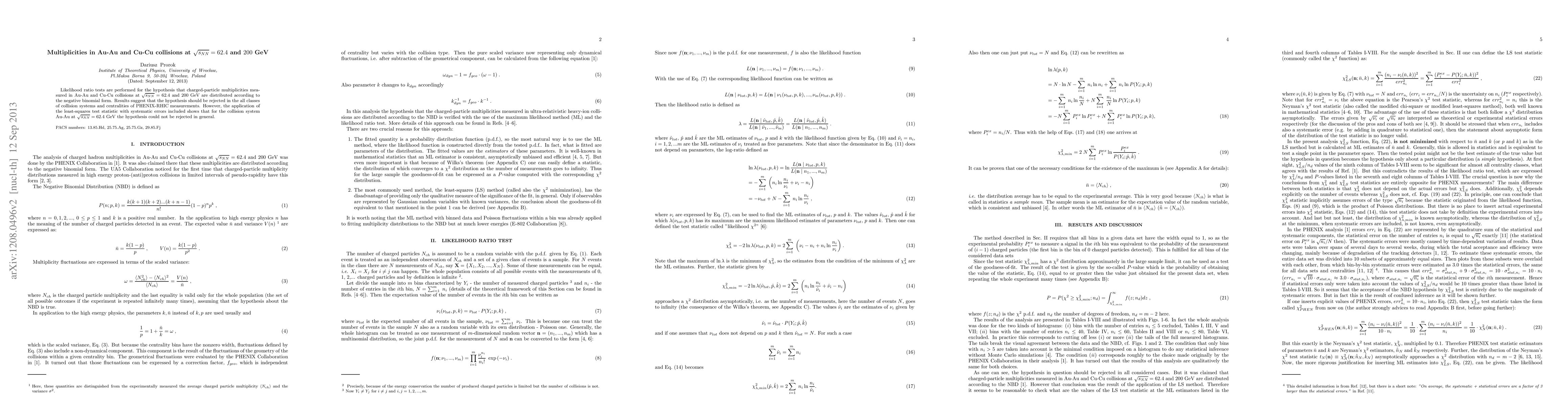 This study uses likelihood ratio tests to evaluate the distribution of charged-particle multiplicities in Au-Au and Cu-Cu collisions at 62.4 and 200 GeV, finding that the negative binomial distribution does not fit the data in most cases. However, for Au-Au collisions at 62.4 GeV, the hypothesis is not rejected when systematic errors are considered.