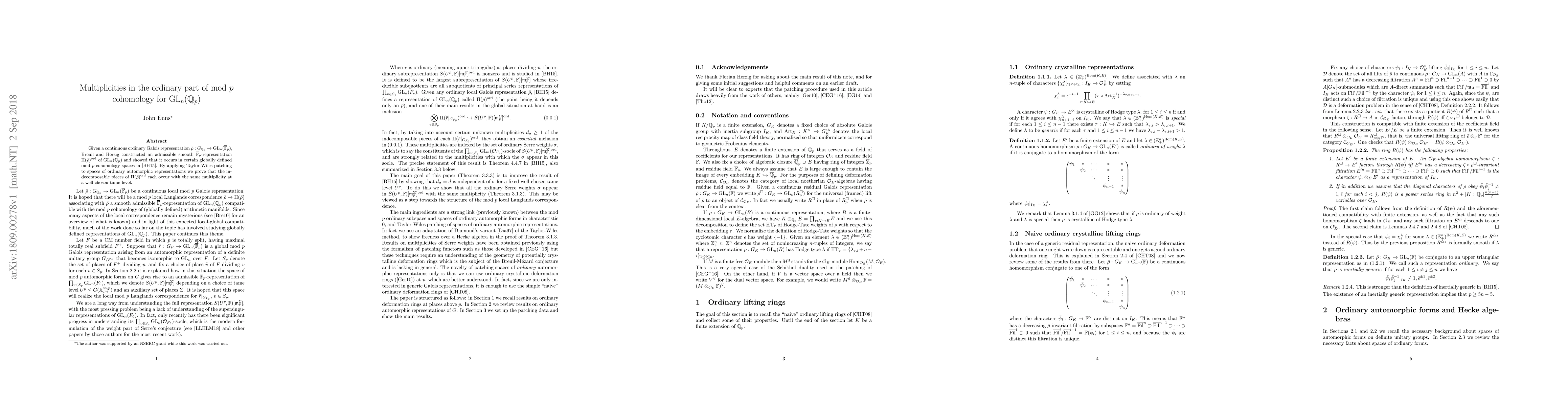 This paper investigates the multiplicities of ordinary Galois representations in mod $p$ cohomology for $\mathrm{GL}_n(\mathbb{Q}_p)$. Using Taylor-Wiles patching, it demonstrates that the indecomposable components of a constructed representation appear with equal multiplicity at a specific tame level.