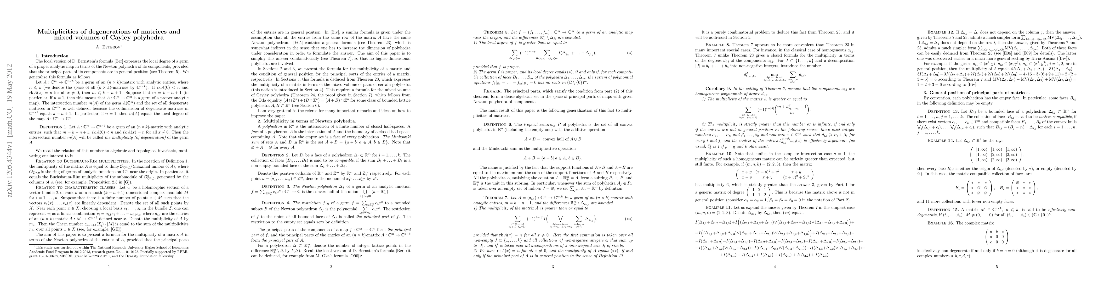 Summary: This paper computes the multiplicity of the common zero of maximal minors for matrices of generic homogeneous polynomials using a Pick-type formula for the mixed volume of Cayley polyhedra. The result provides insight into the degenerations of matrices and their associated geometric structures.