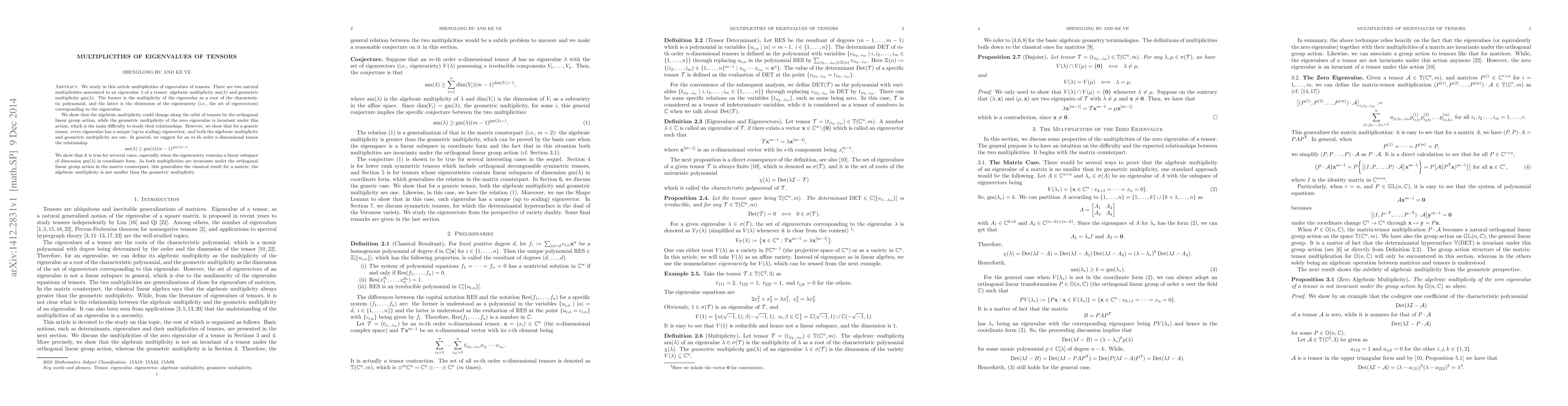 This paper explores the multiplicities of eigenvalues in tensors, showing that algebraic multiplicity can change with tensor transformations but geometric multiplicity remains invariant, establishing a relationship between the two.