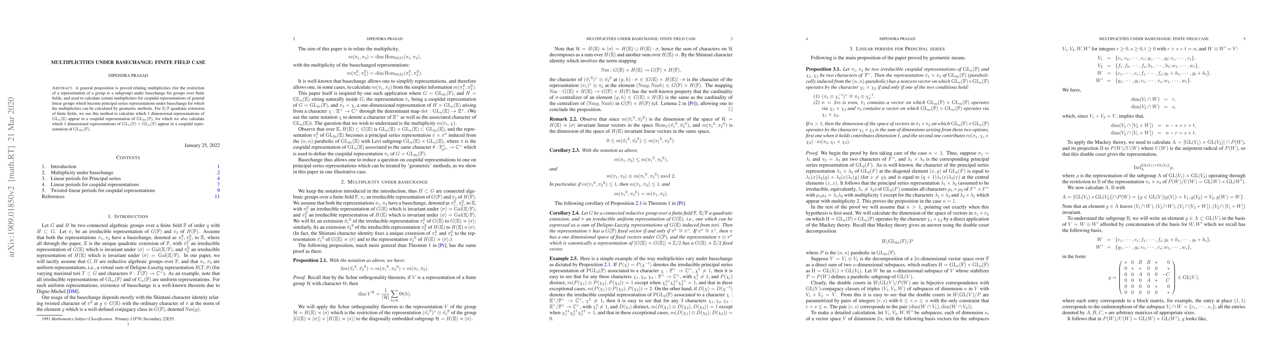 This paper proves a proposition connecting multiplicities in group representations under basechange, specifically for finite fields, and applies it to compute multiplicities for cuspidal representations transforming into principal series under basechange, utilizing geometric methods for calculation.