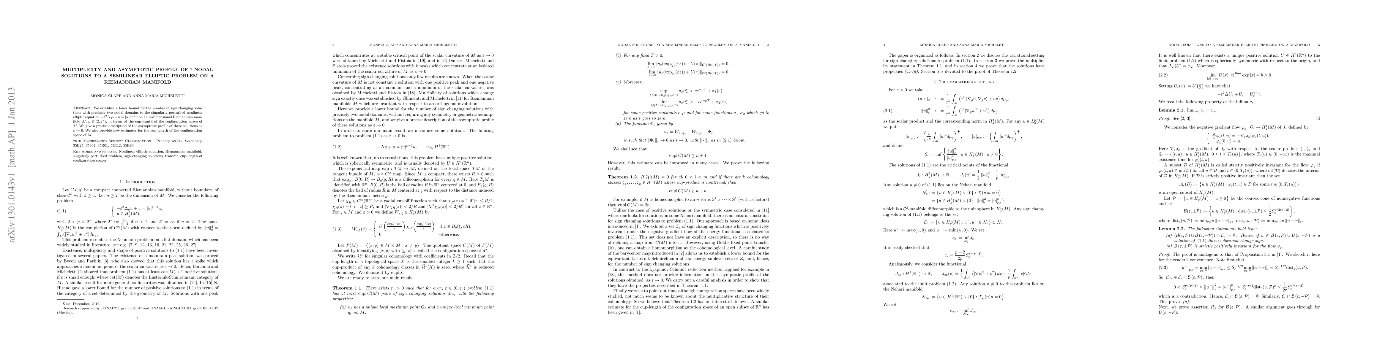 We establish a lower bound for the number of sign changing solutions with precisely two nodal domains to the singularly perturbed nonlinear elliptic equation -{\epsilon}^{2}{\Delta}_{g}u+u=|u|^{p-2}u on an n-dimensional Riemannian manifold M, p in (2,2n/(n-2)), in terms of the cup-length of the configuration space of M. We give a precise description of the asymptotic profile of these solutions as {\epsilon} goes to 0. We also provide new estimates for the cup-length of the configuration space of M.