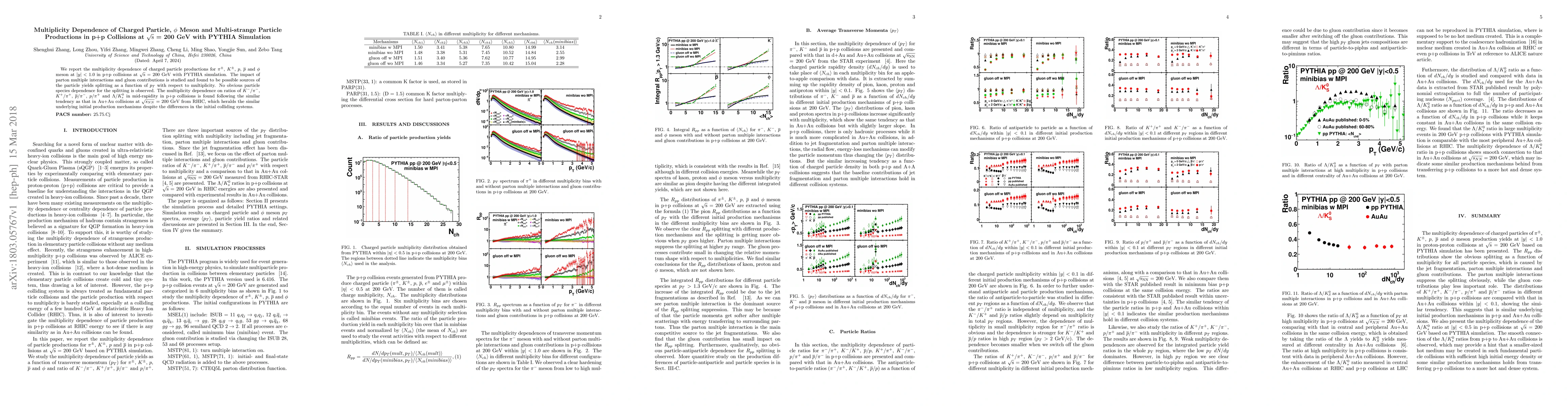 We report the multiplicity dependence of charged particle productions for $\pi^{\pm}$, $K^{\pm}$, $p$, $\overline{p}$ and $\phi$ meson at $|y| < 1.0$ in p+p collisions at $\sqrt{\rm s}$ = 200 GeV with $\rm PYTHIA$ simulation. The impact of parton multiple interactions and gluon contributions is studied and found to be possible sources of the particle yields splitting as a function of $p_T$ with respect to multiplicity. No obvious particle species dependence for the splitting is observed. The multiplicity dependence on ratios of $K^-/\pi^-$, $K^+/\pi^+$, $\overline{p}/\pi^-$, $p/\pi^+$ and $\Lambda/K^{0}_{s}$ in mid-rapidity in p+p collisions is found following the similar tendency as that in Au+Au collisions at $\sqrt{s_{NN}}$ = 200 GeV from RHIC, which heralds the similar underlying initial production mechanisms despite the differences in the initial colliding systems.