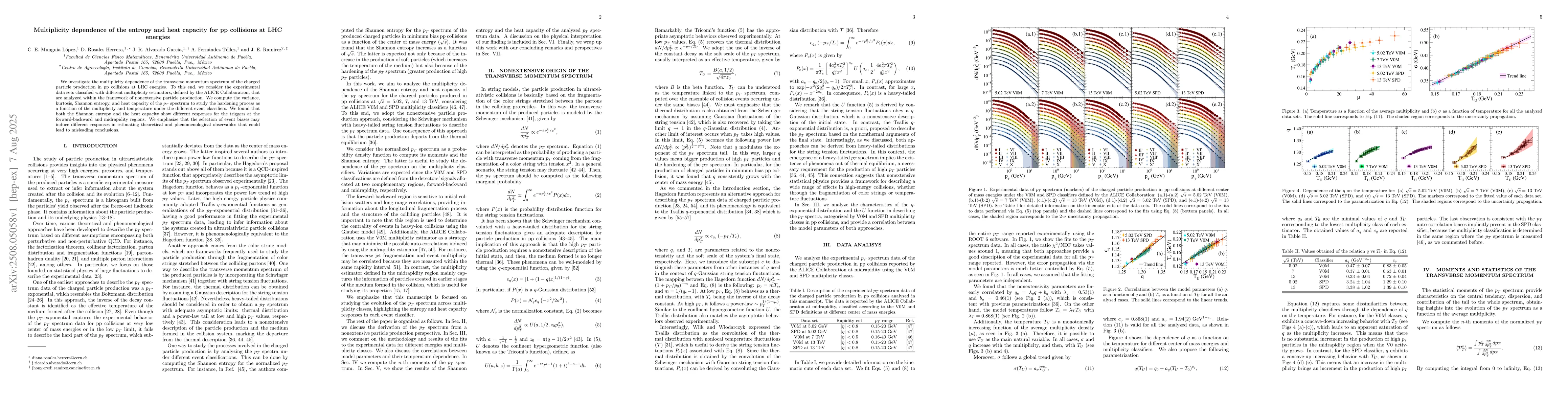 We investigate the multiplicity dependence of the transverse momentum spectrum of the charged particle production in pp collisions at LHC energies. To this end, we consider the experimental data sets classified with different multiplicity estimators, defined by the ALICE Collaboration, that are analyzed within the framework of nonextensive particle production. We compute the variance, kurtosis, Shannon entropy, and heat capacity of the $p_T$ spectrum to study the hardening process as a function of the multiplicity and temperature under the different event classifiers. We found that both the Shannon entropy and the heat capacity show different responses for the triggers at the forward-backward and midrapidity regions. We emphasize that the selection of event biases may induce different responses in estimating theoretical and phenomenological observables that could lead to misleading conclusions.