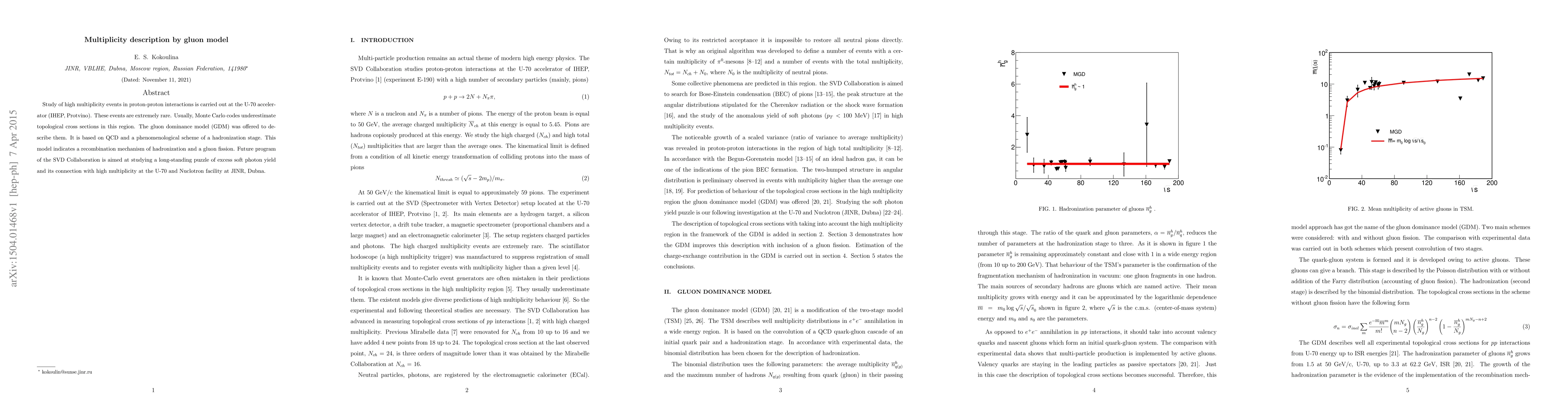 Study of high multiplicity events in proton-proton interactions is carried out at the U-70 accelerator (IHEP, Protvino). These events are extremely rare. Usually, Monte Carlo codes underestimate topological cross sections in this region. The gluon dominance model (GDM) was offered to describe them. It is based on QCD and a phenomenological scheme of a hadronization stage. This model indicates a recombination mechanism of hadronization and a gluon fission. Future program of the SVD Collaboration is aimed at studying a long-standing puzzle of excess soft photon yield and its connection with high multiplicity at the U-70 and Nuclotron facility at JINR, Dubna.
