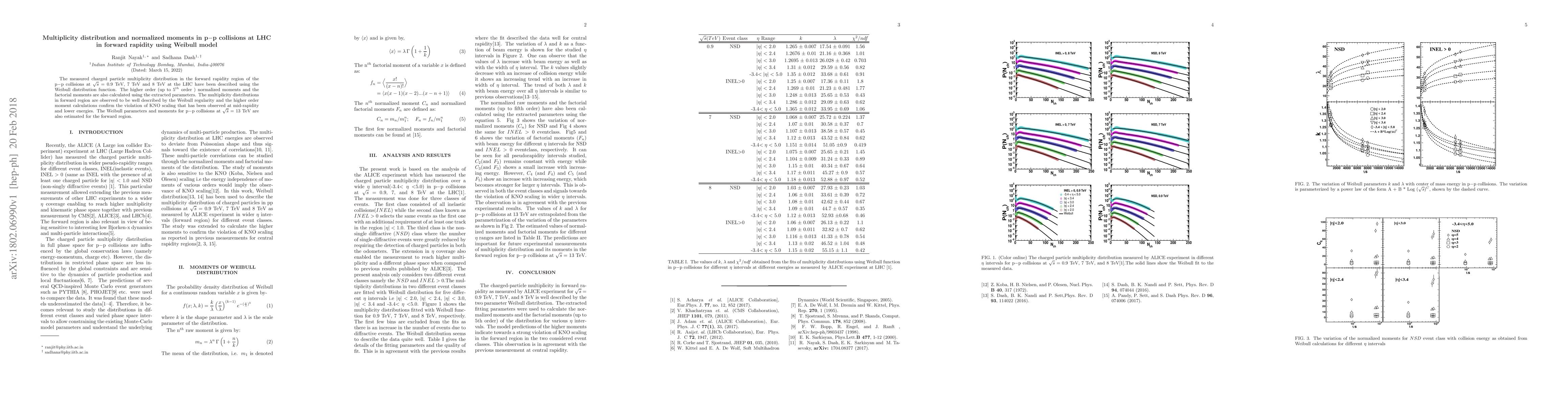 This paper describes the charged particle multiplicity distribution in forward rapidity p$-$p collisions at LHC using the Weibull model, finding good agreement with the model. Higher-order normalized moments and factorial moments are calculated, confirming the violation of KNO scaling observed at lower energies.