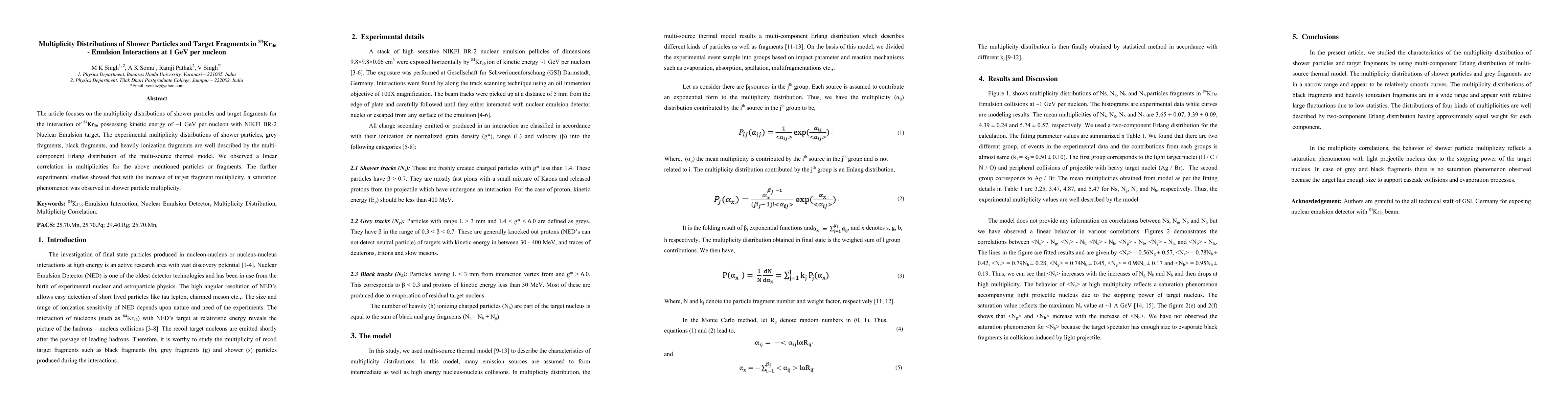 Research on 84^Kr_36 interactions with NIKFI BR-2 Nuclear Emulsion targets found that shower particle multiplicities correlate linearly with target fragment multiplicity, exhibiting a saturation phenomenon at higher fragment multiplicities.