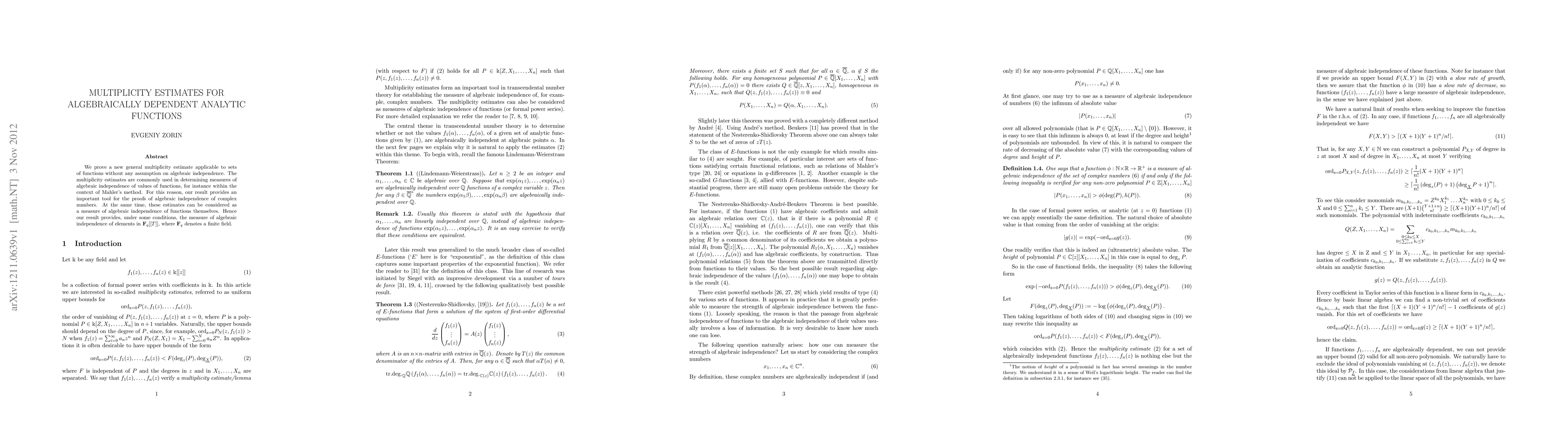 The paper proves a new multiplicity estimate for algebraically dependent analytic functions, providing an important tool for proving algebraic independence of complex numbers and offering insight into the measure of algebraic independence of functions.