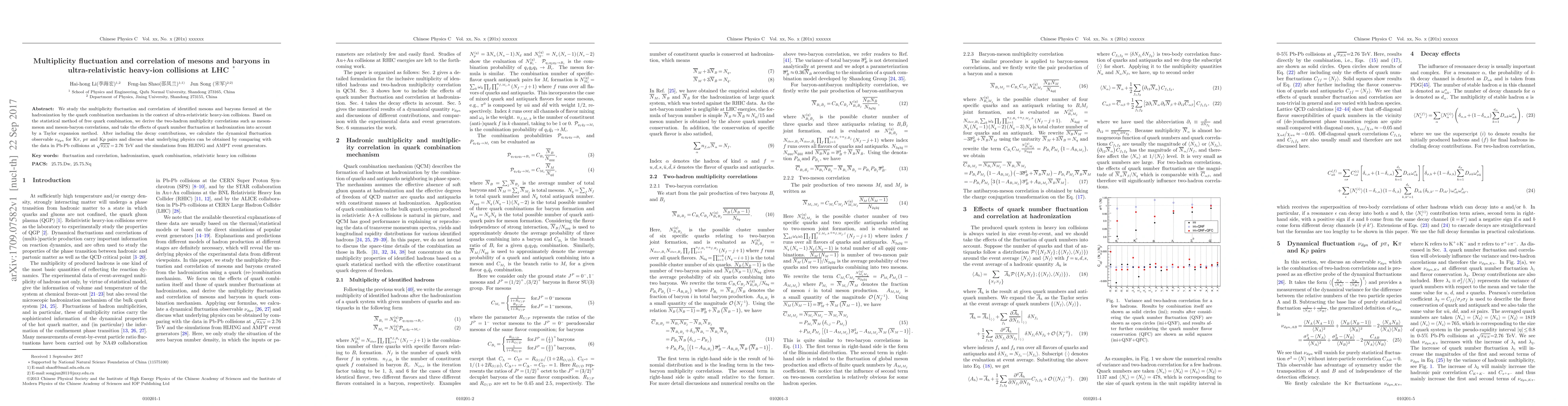 This paper investigates multiplicity fluctuations and correlations of mesons and baryons in ultra-relativistic heavy-ion collisions at the LHC, employing statistical methods to derive two-hadron correlations and considering quark number fluctuations. The study compares calculated dynamical fluctuation observables with experimental data and simulations to infer underlying physics.