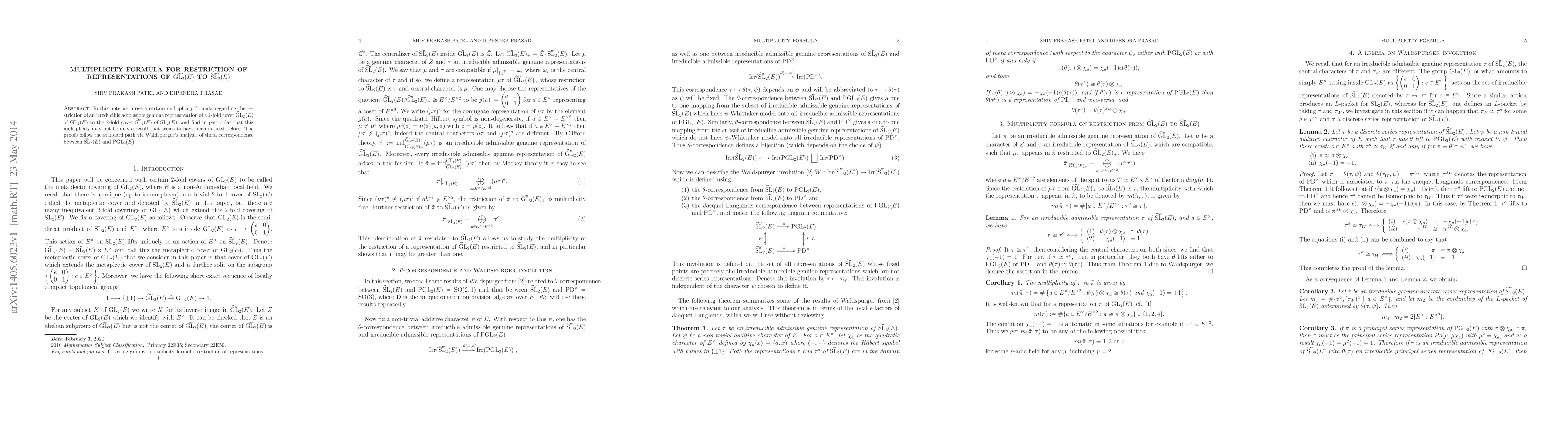 In this note we prove a certain multiplicity formula regarding the restriction of an irreducible admissible genuine representation of a 2-fold cover $\widetilde{{\rm GL}}_{2}(E)$ of ${\rm GL}_{2}(E)$ to the 2-fold cover $\widetilde{{\rm SL}}_{2}(E)$ of ${\rm SL}_{2}(E)$, and find in particular that this multiplicity may not be one, a result that seems to have been noticed before. The proofs follow the standard path via Waldspurger's analysis of theta correspondence between $\widetilde{{\rm SL}}_{2}(E)$ and ${\rm PGL}_{2}(E)$.