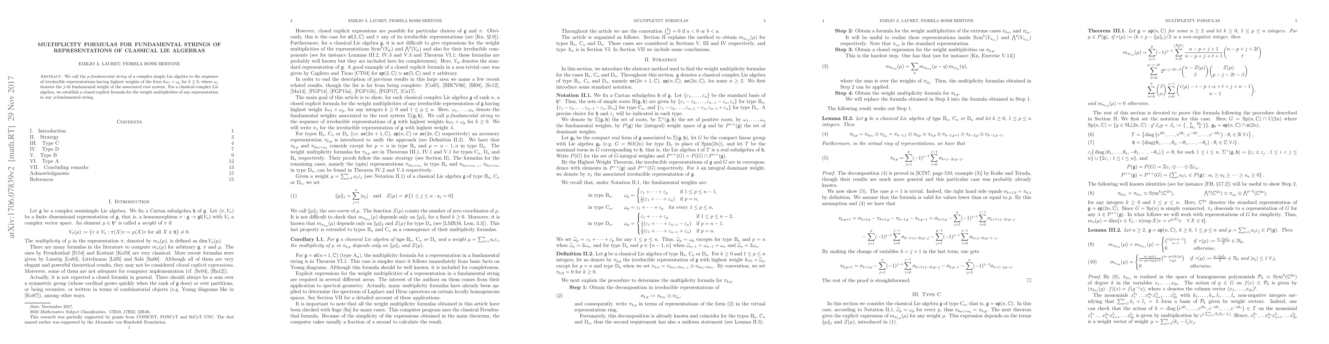 We call the \emph{$p$-fundamental string} of a complex simple Lie algebra to the sequence of irreducible representations having highest weights of the form $k\omega_1+\omega_p$ for $k\geq0$, where $\omega_j$ denotes the $j$-th fundamental weight of the associated root system. For a classical complex Lie algebra, we establish a closed explicit formula for the weight multiplicities of any representation in any $p$-fundamental string.