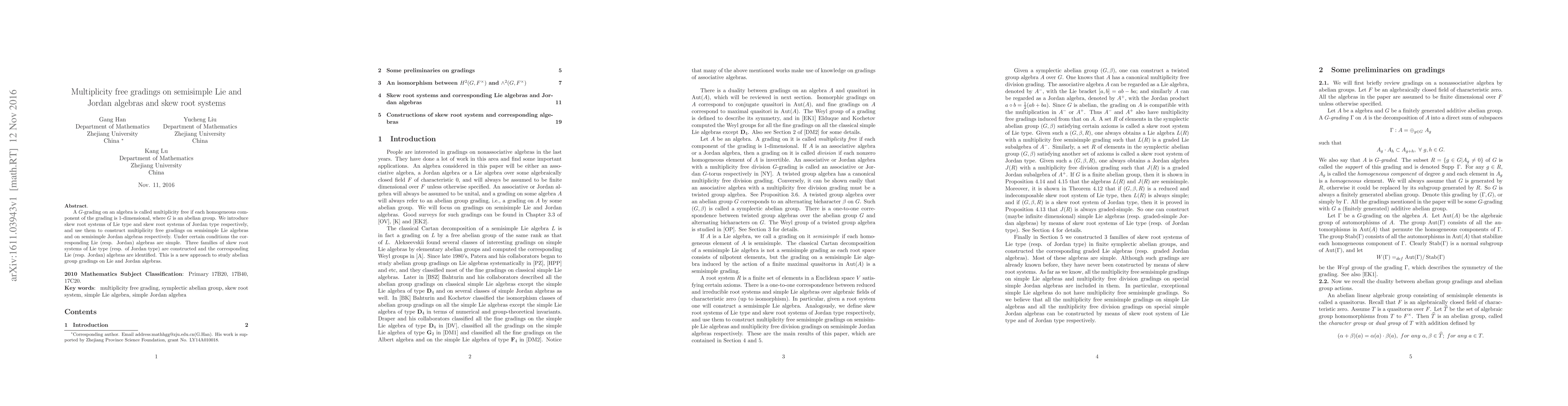 Summary: The paper introduces skew root systems to construct multiplicity free gradings on semisimple Lie and Jordan algebras, identifying three families of such systems and corresponding simple algebras, thus providing a novel method for studying abelian group gradings in these algebraic structures.