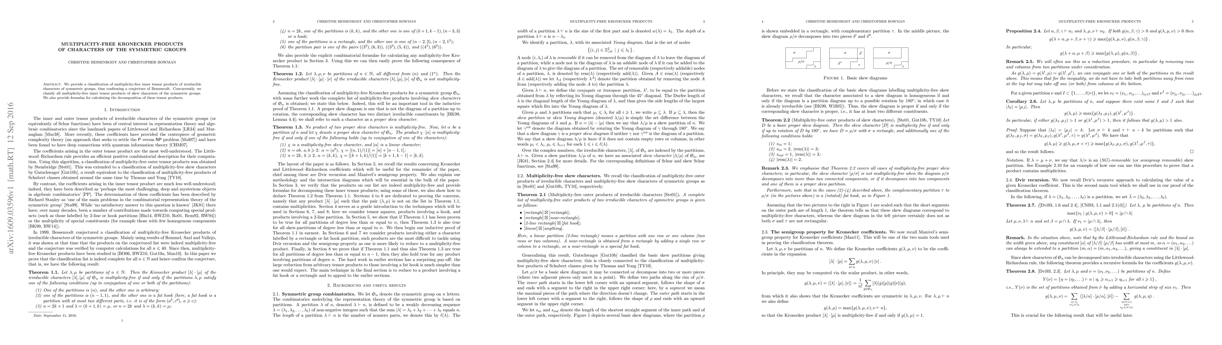 This paper classifies the multiplicity-free inner tensor products of irreducible characters of symmetric groups, confirming Bessenrodt's conjecture, and also extends the classification to skew characters. Additionally, it provides formulas for decomposing these tensor products.