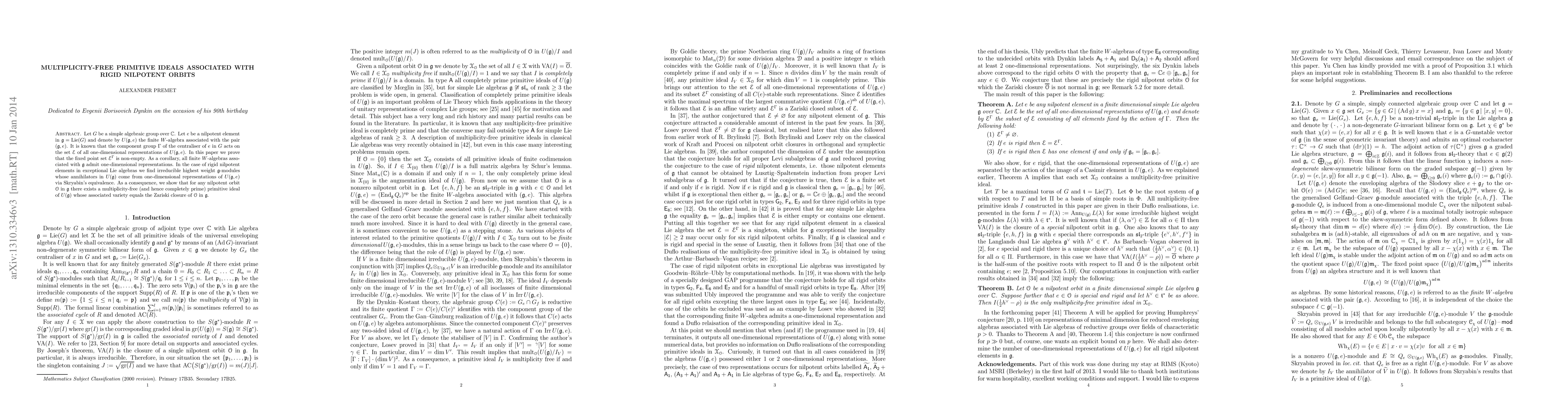 This paper proves the existence of a one-dimensional representation in finite W-algebras fixed by the component group of the centralizer of a nilpotent element. It also establishes a multiplicity-free primitive ideal in the universal enveloping algebra whose associated variety matches the Zariski closure of any given nilpotent orbit.