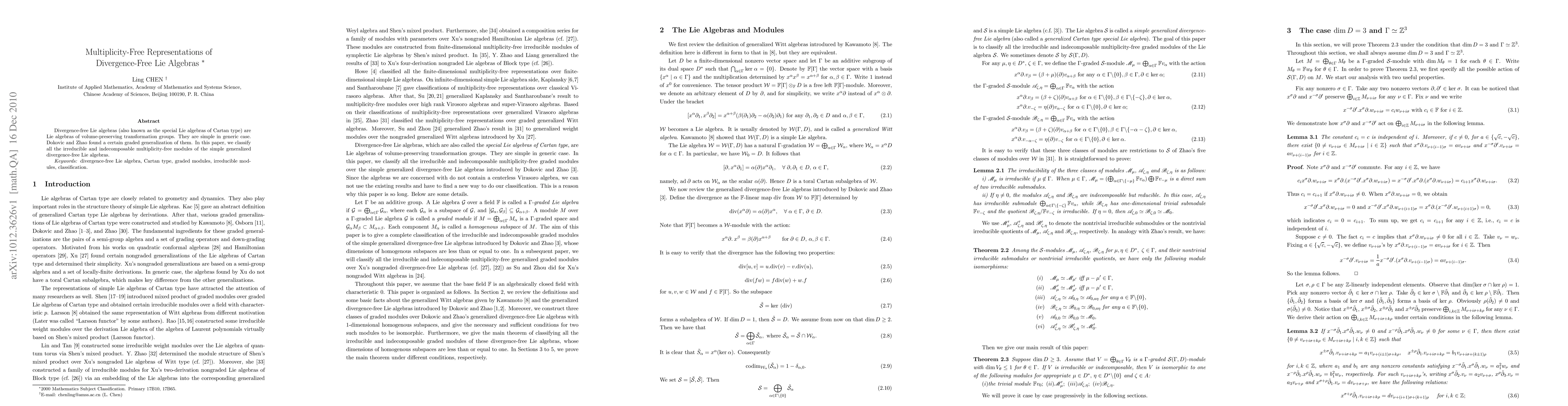This paper classifies all irreducible and indecomposable multiplicity-free representations of simple generalized divergence-free Lie algebras, which are Lie algebras of volume-preserving transformation groups. It builds on previous work by Dokovic and Zhao on graded generalizations of these algebras.