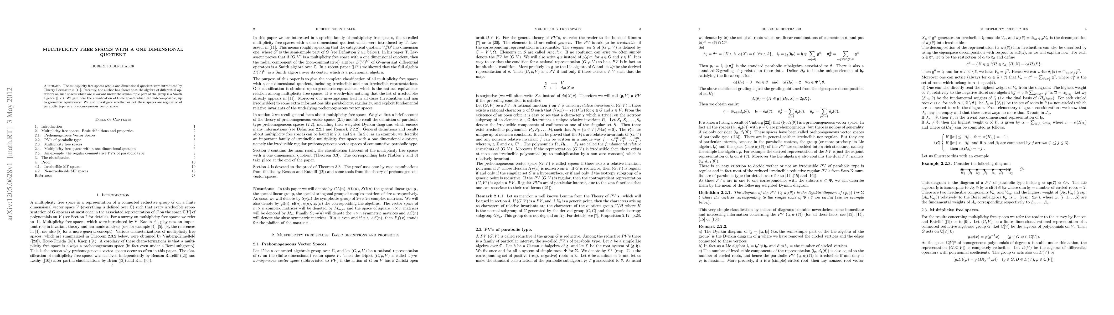 The multiplicity free spaces with a one dimensional quotient were introduced by Thierry Levasseur in [11]. Recently, the author has shown that the algebra of differential operators on such spaces which are invariant under the semi-simple part of the group is a Smith algebra ([17]). We give here the classification of these spaces which are indecomposable, up to geometric equivalence. We also investigate whether or not these spaces are regular or of parabolic type as a prehomogeneous vector space.
