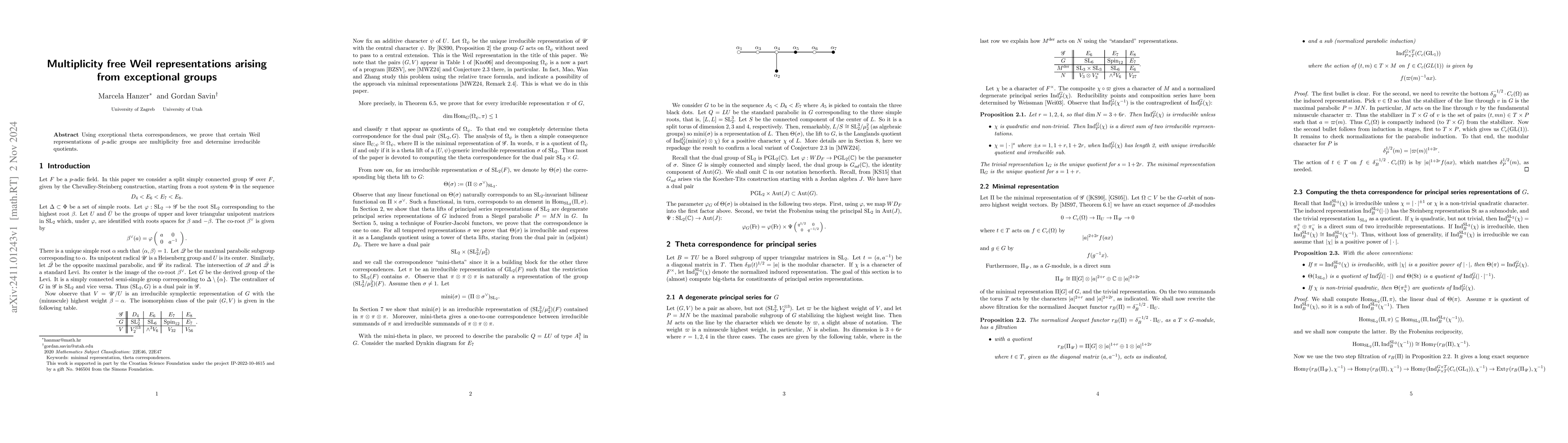 This paper proves that specific Weil representations of $p$-adic groups, derived from exceptional groups through exceptional theta correspondences, are multiplicity free and identifies their irreducible quotients.