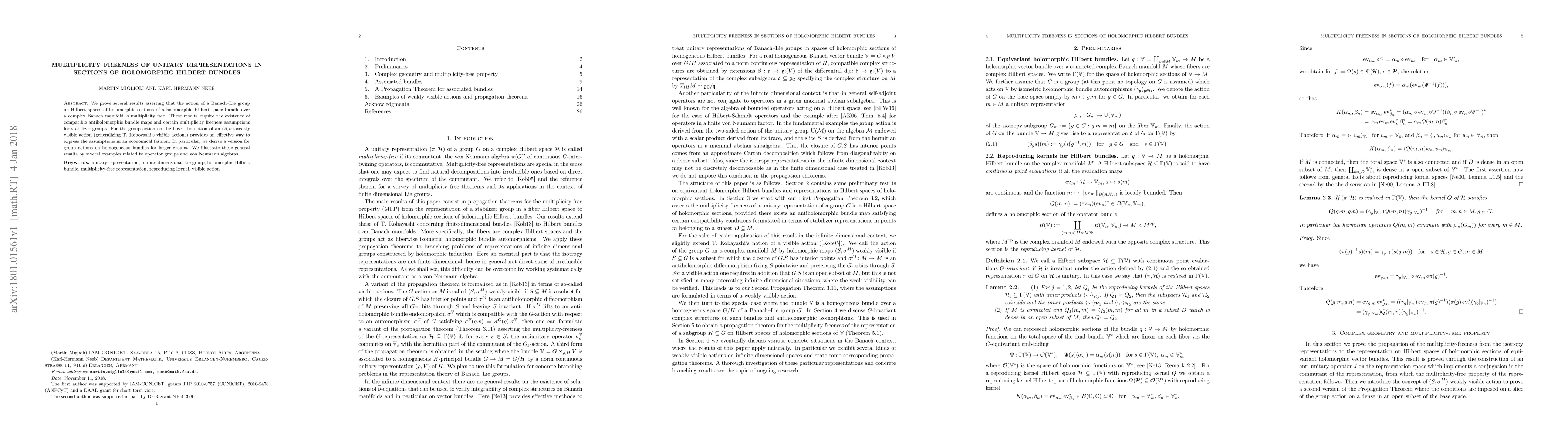 We prove several results asserting that the action of a Banach-Lie group on Hilbert spaces of holomorphic sections of a holomorphic Hilbert space bundle over a complex Banach manifold is multiplicity free. These results require the existence of compatible antiholomorphic bundle maps and certain multiplicity freeness assumptions for stabilizer groups. For the group action on the base, the notion of an $(S,\sigma)$-weakly visible action (generalizing T.Koboyashi's visible actions) provides an effective way to express the assumptions in an economical fashion. In particular, we derive a version for group actions on homogeneous bundles for larger groups. We illustrate these general results by several examples related to operator groups and von Neumann algebras.