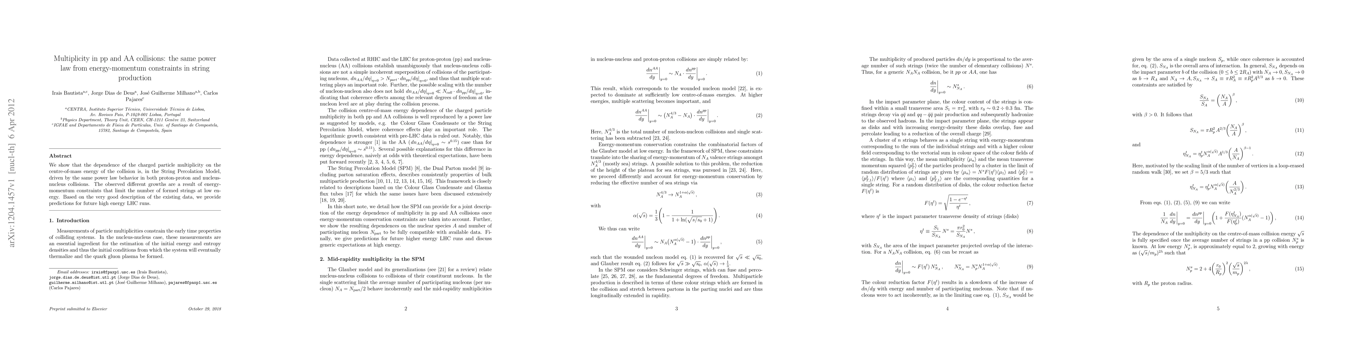 We show that the dependence of the charged particle multiplicity on the centre-of-mass energy of the collision is, in the String Percolation Model, driven by the same power law behavior in both proton-proton and nucleus- nucleus collisions. The observed different growths are a result of energy- momentum constraints that limit the number of formed strings at low en- ergy. Based on the very good description of the existing data, we provide predictions for future high energy LHC runs.