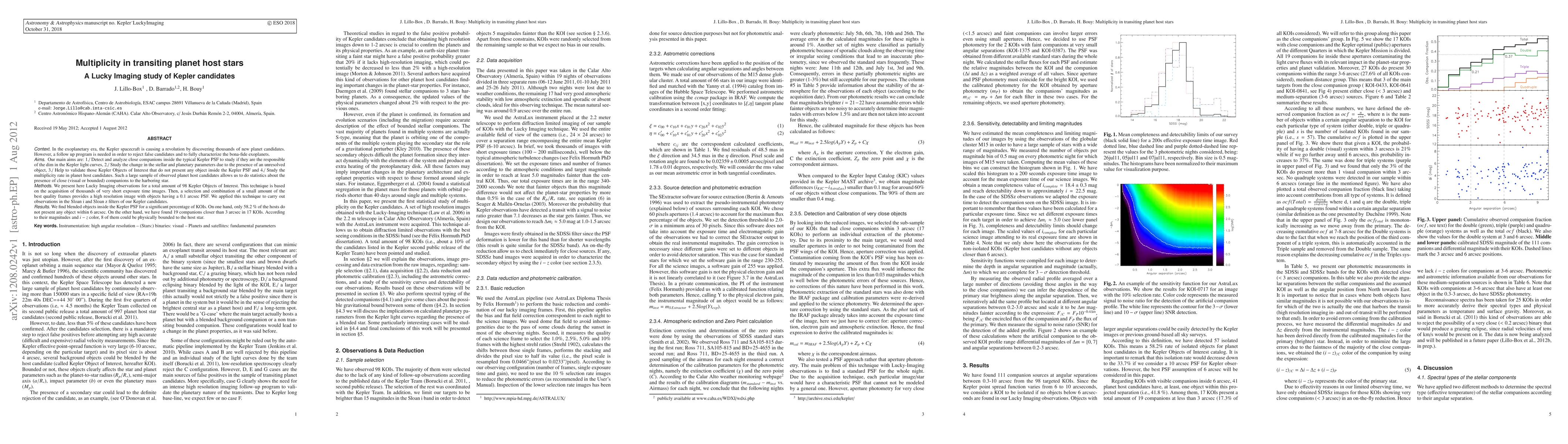 In the exoplanetary era, the Kepler spacecraft is causing a revolution by discovering thousands of new planet candidates. However, a follow up program is needed in order to reject false candidates and to fully characterize the bona-fide exoplanets. Our main aims are: 1./ Detect and analyze close companions inside the typical Kepler PSF to study if they are the responsible of the dim in the Kepler light curves, 2./ Study the change in the stellar and planetary parameters due to the presence of an unresolved object, 3./ Help to validate those Kepler Objects of Interest that do not present any object inside the Kepler PSF and 4./ Study the multiplicity rate in planet host candidates. Such a large sample of observed planet host candidates allows us to do statistics about the presence of close (visual or bounded) companions to the harboring star. We present here Lucky Imaging observations for a total amount of 98 Kepler Objects of Interest. This technique is based on the acquisition of thousands of very short exposure time images. Then, a selection and combination of a small amount of the best quality frames provides a high resolution image with objects having a 0.1 arcsec PSF. We applied this technique to carry out observations in the Sloan i and Sloan z filters of our Kepler candidates. We find blended objects inside the Kepler PSF for a significant percentage of KOIs. On one hand, only 58.2% of the hosts do not present any object within 6 arcsec. On the other hand, we have found 19 companions closer than 3 arcsec in 17 KOIs. According to their magnitudes and i-z color, 8 of them could be physically bounded to the host star.