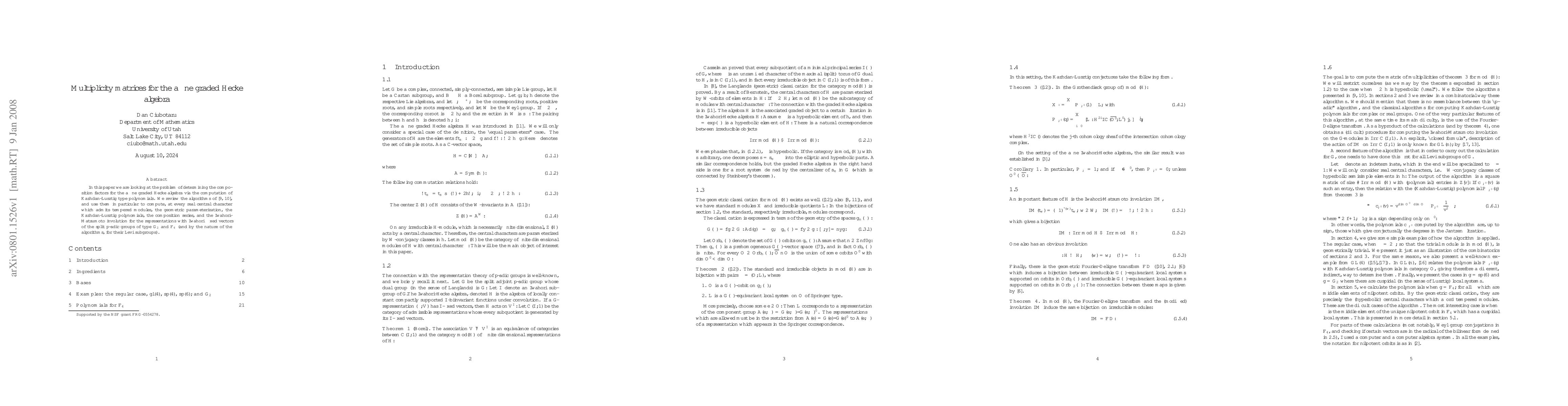 In this paper, we look at the problem of determining the composition factors for the affine graded Hecke algebra via the computation of Kazhdan-Lusztig type polynomials. We review the algorithms of \cite{L1,L2}, and use them in particular to compute, at every real central character which admits tempered modules, the geometric parameterization, the Kazhdan-Lusztig polynomials, the composition series, and the Iwahori-Matsumoto involution for the representations with Iwahori fixed vectors of the split $p$-adic groups of type $G_2$ and $F_4$.