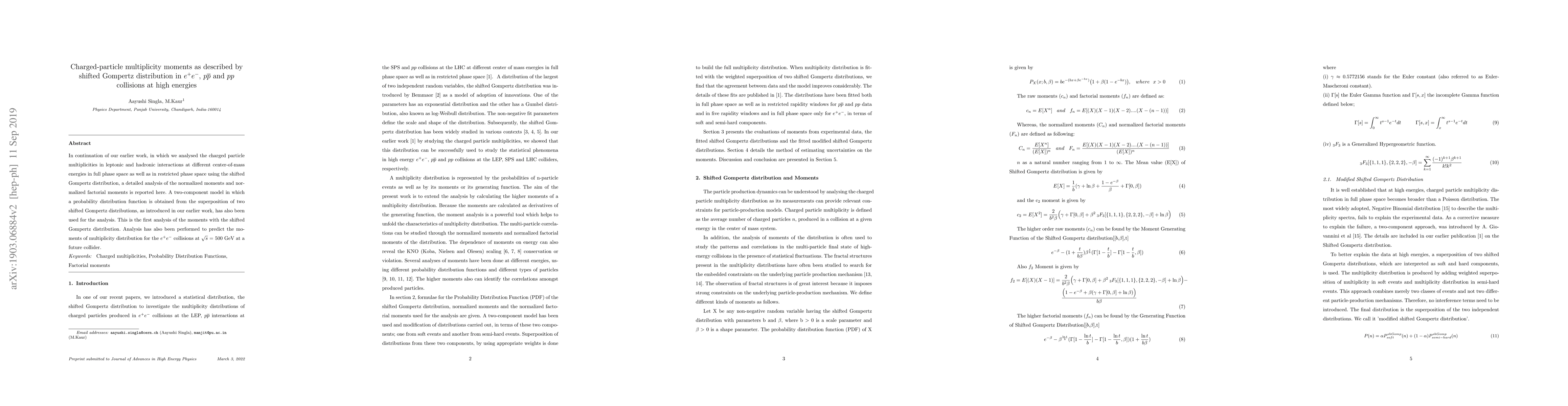 Researchers analyzed charged particle multiplicities in high-energy collisions using the shifted Gompertz distribution, finding key moments for proton-antiproton and electron-positron interactions.