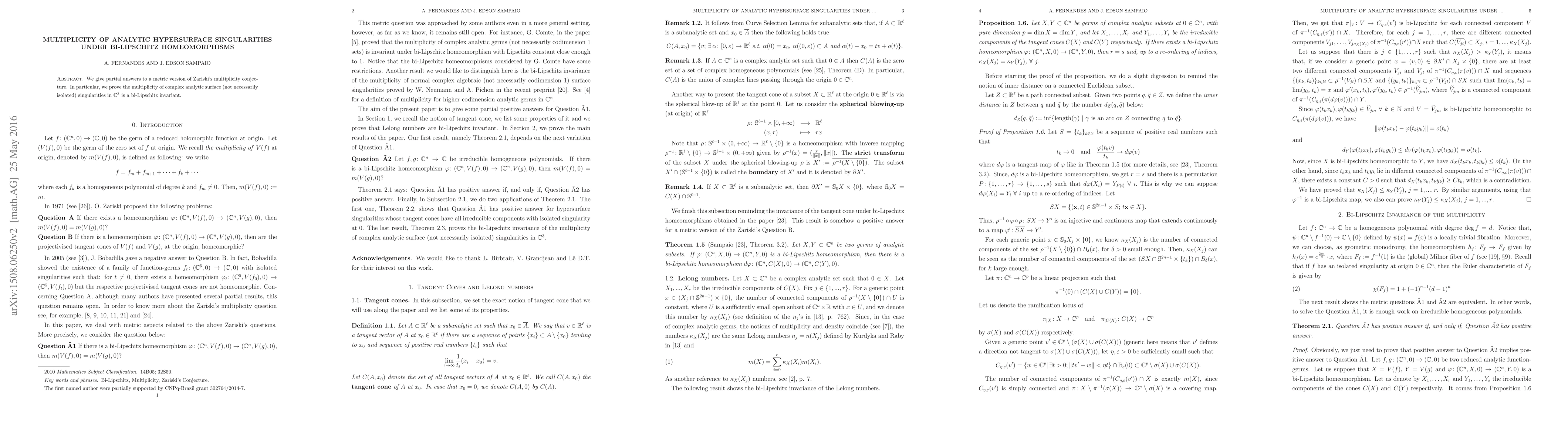 Summary: This paper addresses a metric version of Zariski's multiplicity conjecture, proving that the multiplicity of complex analytic surface singularities in $\mathbb{C}^3$ remains invariant under bi-Lipschitz homeomorphisms. This provides partial resolution to the conjecture.