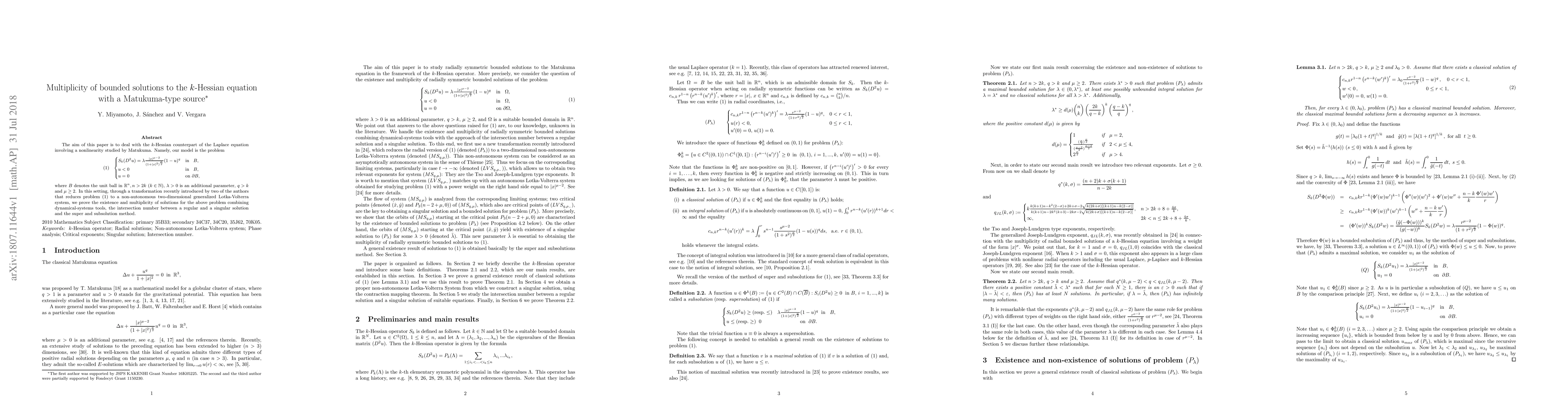 The aim of this paper is to deal with the $k$-Hessian counterpart of the Laplace equation involving a nonlinearity studied by Matukuma. Namely, our model is the problem \begin{equation*} (1)\;\;\;\begin{cases} S_k(D^2u)= \lambda \frac{|x|^{\mu-2}}{(1+|x|^2)^{\frac{\mu}{2}}} (1-u)^q &\mbox{in }\;\; B,\\ u <0 & \mbox{in }\;\; B,\\ u=0 &\mbox{on }\partial B, \end{cases} \end{equation*} where $B$ denotes the unit ball in $\mathbb{R}^n,n>2k$ ($k\in\mathbb{N}$), $\lambda>0$ is an additional parameter, $q>k$ and $\mu\geq 2$. In this setting, through a transformation recently introduced by two of the authors that reduces problem (1) to a non-autonomous two-dimensional generalized Lotka-Volterra system, we prove the existence and multiplicity of solutions for the above problem combining dynamical-systems tools, the intersection number between a regular and a singular solution and the super and subsolution method.