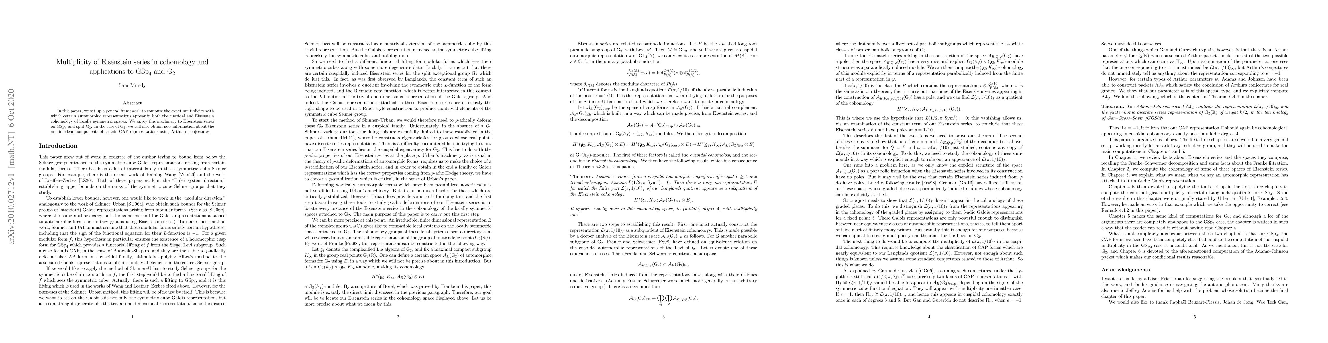 This paper establishes a framework for determining the multiplicity of automorphic representations in cohomology, applying it to Eisenstein series for $GSp_4$ and split $G_2$, and using Arthur's conjectures to gain new insights into the archimedean components of CAP representations for $G_2$.