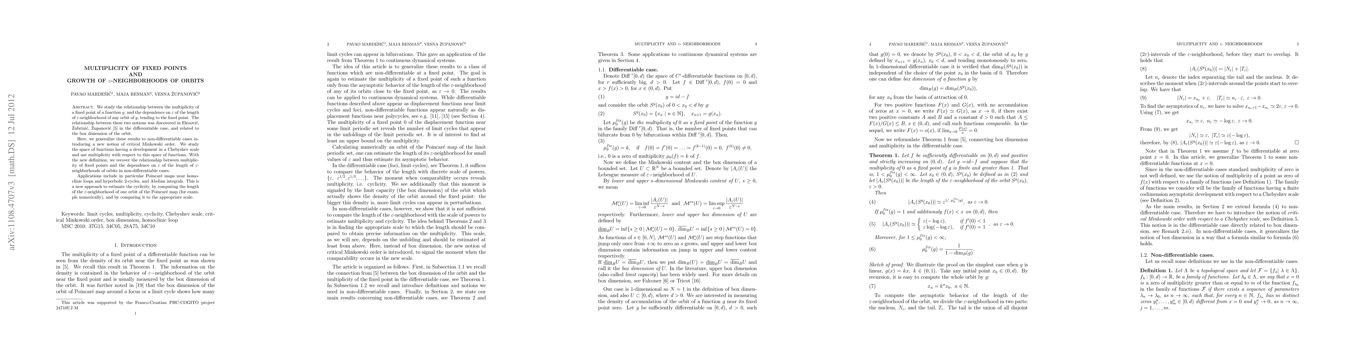 We study the relationship between the multiplicity of a fixed point of a function g, and the dependence on epsilon of the length of epsilon-neighborhood of any orbit of g, tending to the fixed point. The relationship between these two notions was discovered before (Elezovic, Zubrinic, Zupanovic) in the differentiable case, and related to the box dimension of the orbit. Here, we generalize these results to non-differentiable cases introducing a new notion of critical Minkowski order. We study the space of functions having a development in a Chebyshev scale and use multiplicity with respect to this space of functions. With the new definition, we recover the relationship between multiplicity of fixed points and the dependence on epsilon of the length of epsilon-neighborhoods of orbits in non-differentiable cases. Applications include in particular Poincare maps near homoclinic loops and hyperbolic 2-cycles, and Abelian integrals. This is a new approach to estimate the cyclicity, by computing the length of the epsilon-neighborhood of one orbit of the Poincare map (for example numerically), and by comparing it to the appropriate scale.