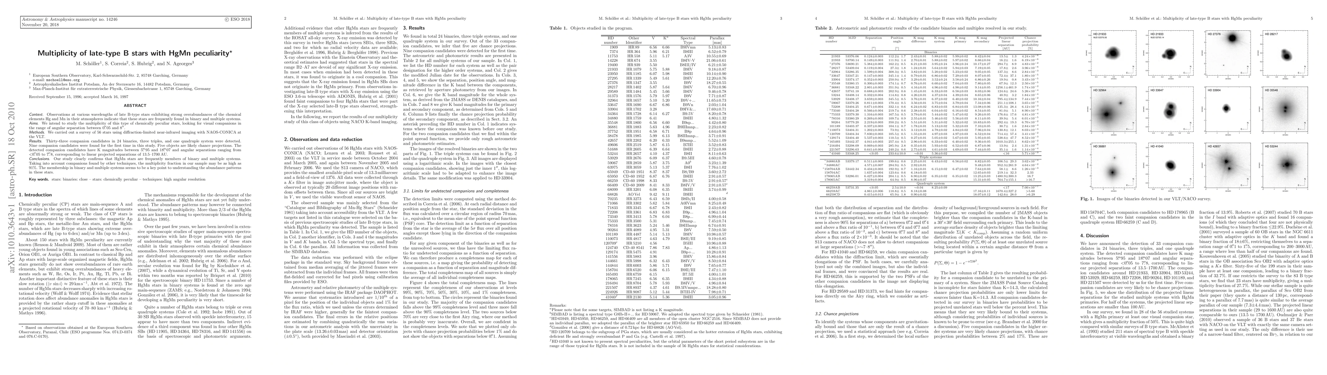 Observations at various wavelengths of late B-type stars exhibiting strong overabundances of the chemical elements Hg and Mn in their atmospheres indicate that these stars are frequently found in binary and multiple systems. We intend to study the multiplicity of this type of chemically peculiar stars, looking for visual companions in the range of angular separation between 0.05" and 8". We carried out a survey of 56 stars using diffraction-limited near-infrared imaging with NAOS-CONICA at the VLT. Thirty-three companion candidates in 24 binaries, three triples, and one quadruple system were detected. Nine companion candidates were found for the first time in this study. Five objects are likely chance projections. The detected companion candidates have K magnitudes between 5.95m and 18.07m and angular separations ranging from <0.05" to 7.8", corresponding to linear projected separations of 13.5-1700 AU. Our study clearly confirms that HgMn stars are frequently members of binary and multiple systems. Taking into account companions found by other techniques, the multiplicity fraction in our sample may be as high as 91%. The membership in binary and multiple systems seems to be a key point to understanding the abundance patterns in these stars.