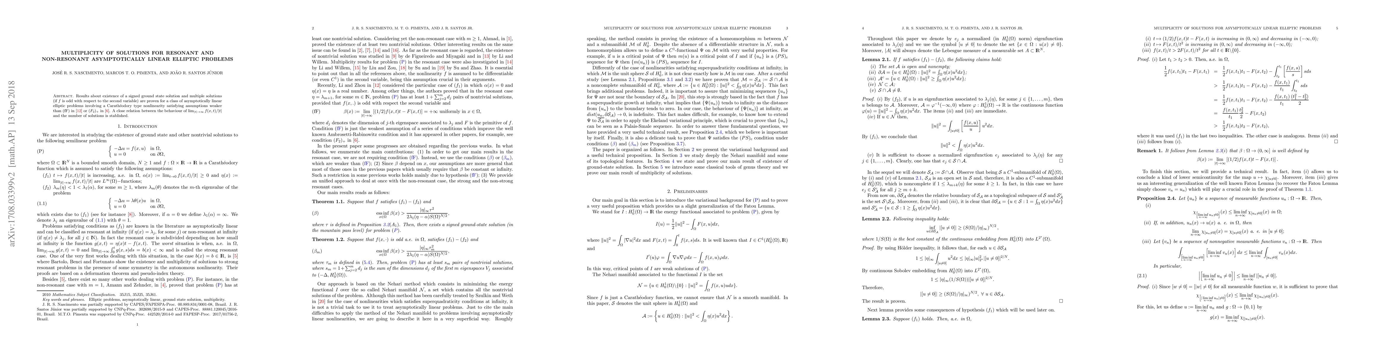 Results about existence of a signed ground state solution and multiple solutions (if $f$ is odd with respect to the second variable) are proven for a class of asymptotically linear elliptic problems involving a Carath\'eodory type nonlinearity satisfying assumptions weaker than (fF) in \cite{GLZ} or $(F_{2})_{+}$ in \cite{CM}. A close relation between the behaviour of $\lim_{|t|\to \infty}f(x, t)/|t|$ and the number of solutions is stablished.