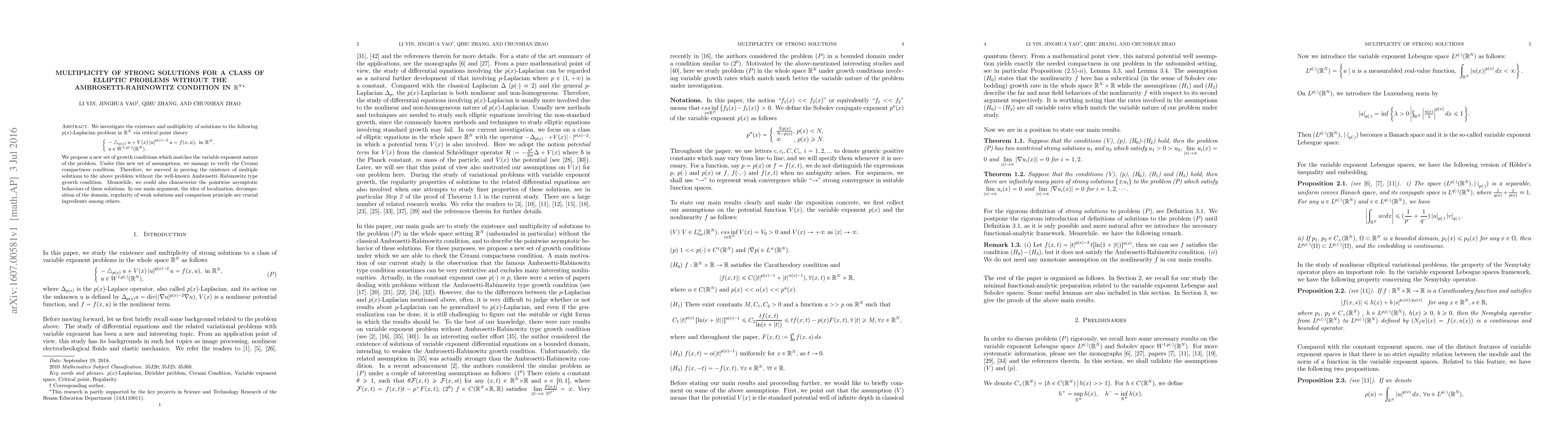 We investigate the existence and multiplicity of solutions to the following $p(x)$-Laplacian problem in $\mathbb{R}^{N}$ via critical point theory \begin{equation*} \left\{ \begin{array}{l} -\bigtriangleup _{p(x)}u+V(x)\left\vert u\right\vert ^{p(x)-2}u=f(x,u),\text{ in } \mathbb{R}^{N}, \\ u\in W^{1,p(\cdot )}(\mathbb{R}^{N}). \end{array} \right. \end{equation*} We propose a new set of growth conditions which matches the variable exponent nature of the problem. Under this new set of assumptions, we manage to verify the Cerami compactness condition. Therefore, we succeed in proving the existence of multiple solutions to the above problem without the well-known Ambrosetti--Rabinowitz type growth condition. Meanwhile, we could also characterize the pointwise asymptotic behaviors of these solutions. In our main argument, the idea of localization, decomposition of the domain, regularity of weak solutions and comparison principle are crucial ingredients among others.