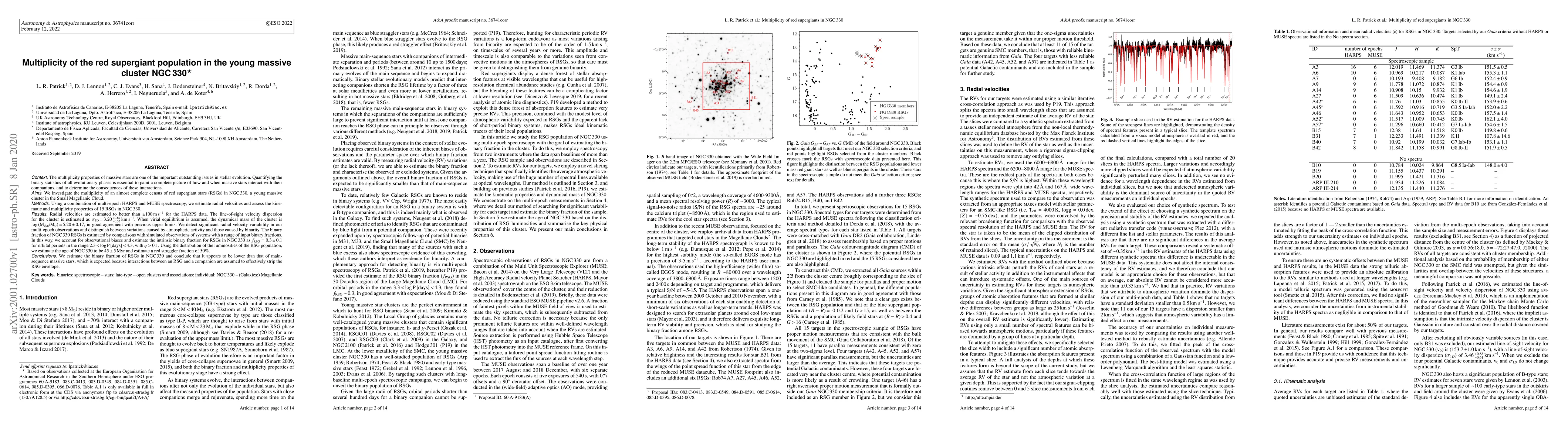 The multiplicity properties of massive stars are one of the important outstanding issues in stellar evolution. Quantifying the binary statistics of all evolutionary phases is essential to paint a complete picture of how and when massive stars interact with their companions, and to determine the consequences of these interactions. We investigate the multiplicity of an almost complete census of red supergiant stars (RSGs) in NGC 330, a young massive cluster in the SMC. Using a combination of multi-epoch HARPS and MUSE spectroscopy, we estimate radial velocities and assess the kinematic and multiplicity properties of 15 RSGs in NGC 330. Radial velocities are estimated to better than +/-100 m/s for the HARPS data. The line-of-sight velocity dispersion for the cluster is estimated as 3.20 +0.69-0.52 km/s. When virial equilibrium is assumed, the dynamical mass of the cluster is log (M{dyn} /M{sun}) = 5.20+/-0.17, in good agreement with previous upper limits. We detect significant radial velocity variability in our multi-epoch observations and distinguish between variations caused by atmospheric activity and those caused by binarity. The binary fraction of NGC 330 RSGs is estimated by comparisons with simulated observations of systems with a range of input binary fractions. In this way, we account for observational biases and estimate the intrinsic binary fraction for RSGs in NGC 330 as f{RSG} = 0.3+/-0.1 for orbital periods in the range 2.3< log P [days] <4.3, with q>0.1. Using the distribution of the luminosities of the RSG population, we estimate the age of NGC 330 to be 45+/-5 Myr and estimate a red straggler fraction of 50%. We estimate the binary fraction of RSGs in NGC 330 and conclude that it appears to be lower than that of main-sequence massive stars, which is expected because interactions between an RSG and a companion are assumed to effectively strip the RSG envelope.