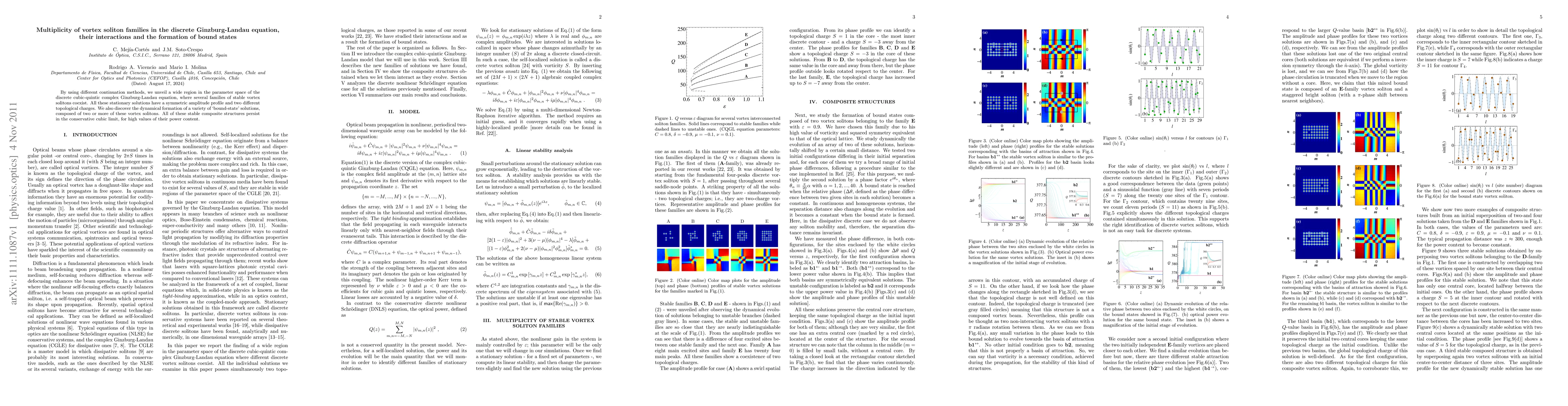 This paper explores the coexistence of multiple stable vortex soliton families in the discrete Ginzburg-Landau equation, revealing their symmetric amplitude profiles and distinct topological charges. It also identifies the formation of bound-state solutions through interactions among these solitons, which remain stable even in the conservative cubic limit.
