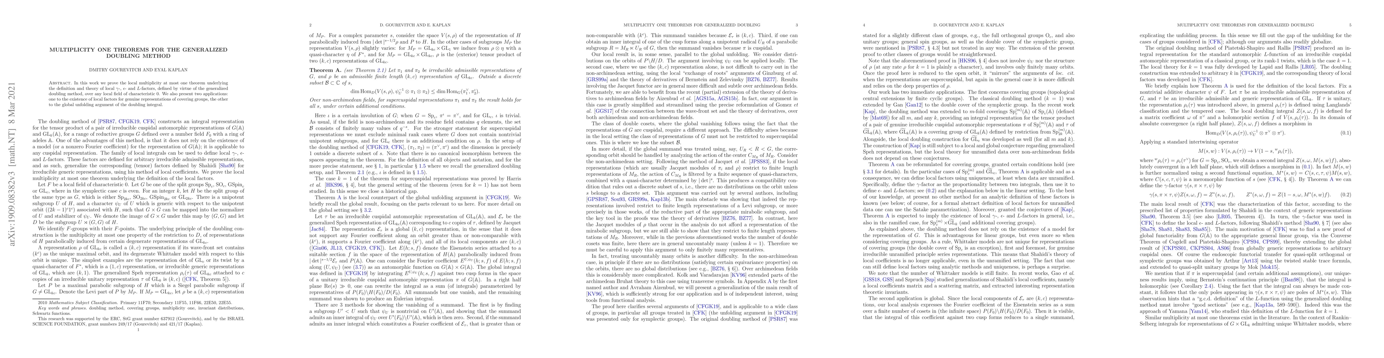 In this work we prove the local multiplicity at most one theorem underlying the definition and theory of local $\gamma$-, $\epsilon$- and $L$-factors, defined by virtue of the generalized doubling method, over any local field of characteristic 0. We also present two applications: one to the existence of local factors for genuine representations of covering groups, the other to the global unfolding argument of the doubling integral.