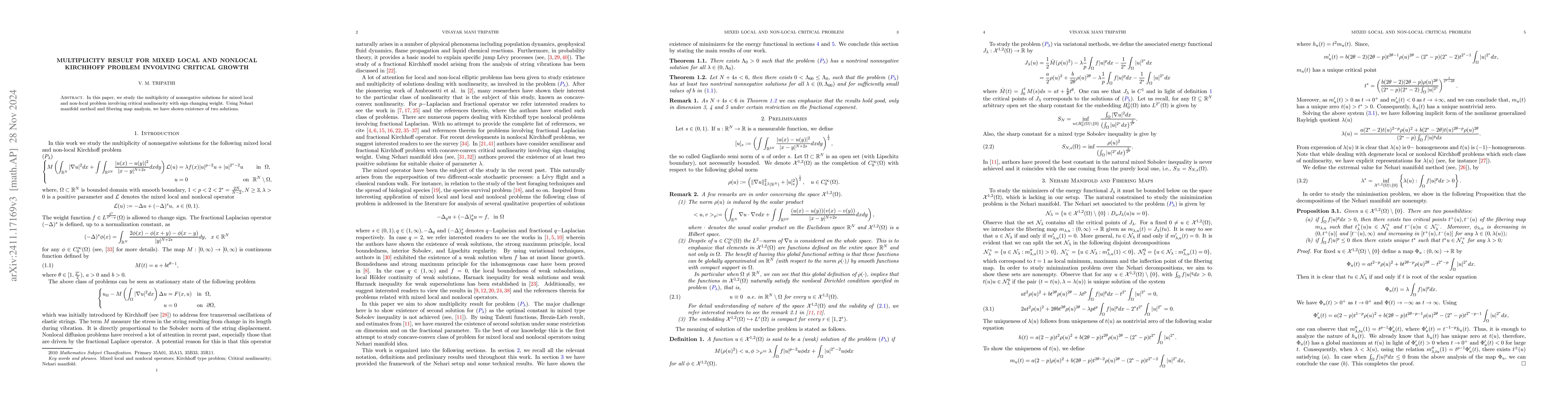 The paper investigates the existence of multiple nonnegative solutions for a mixed local and nonlocal Kirchhoff problem featuring critical growth and a sign-changing weight, demonstrating two solutions via Nehari manifold method and fibering map analysis.
