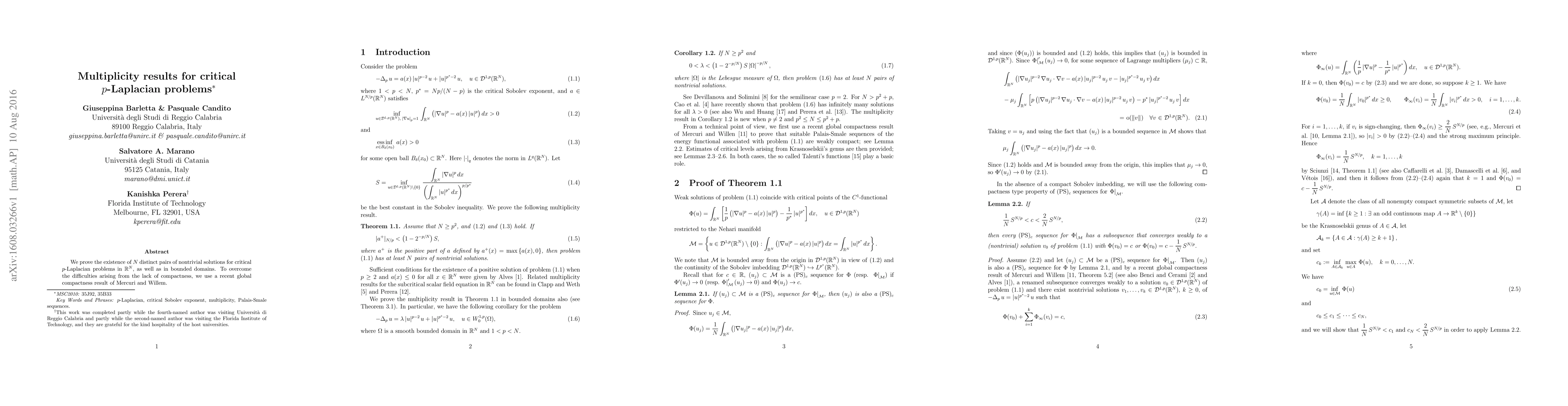 Summary: This paper establishes the existence of $N$ distinct pairs of nontrivial solutions for critical $p$-Laplacian problems in ${\mathbb R}^N$ and bounded domains, utilizing a global compactness result to address non-compactness issues.