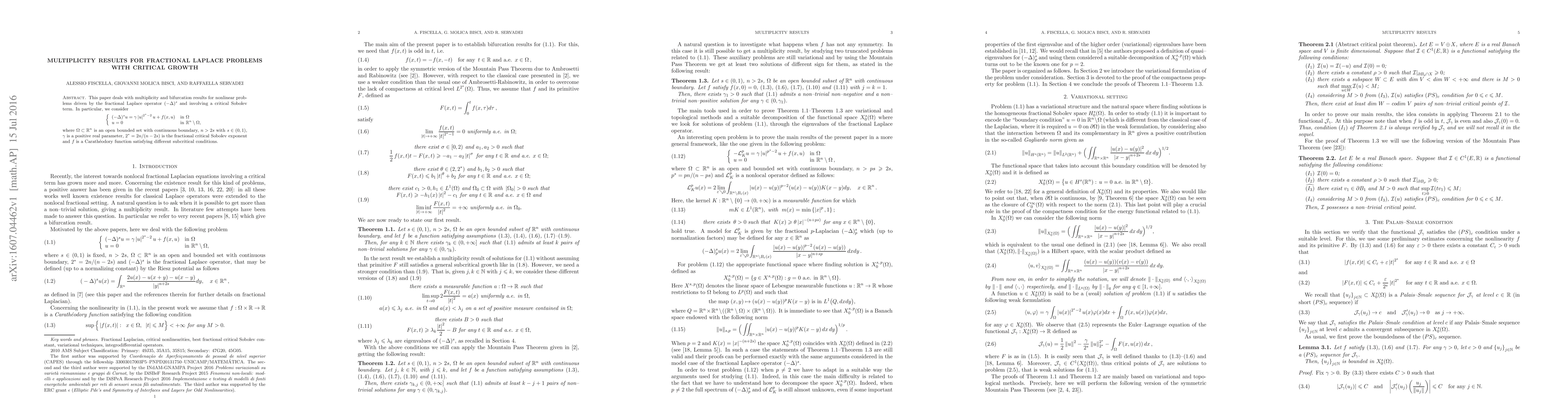 This paper investigates multiplicity and bifurcation results for fractional Laplace problems with critical growth, focusing on the equation $(-\Delta)^su=\gamma|u|^{2^*-2}u+f(x,u)$ in a bounded domain $\Omega$ with $n>2s$. The study explores the behavior of solutions under varying parameters and subcritical conditions.