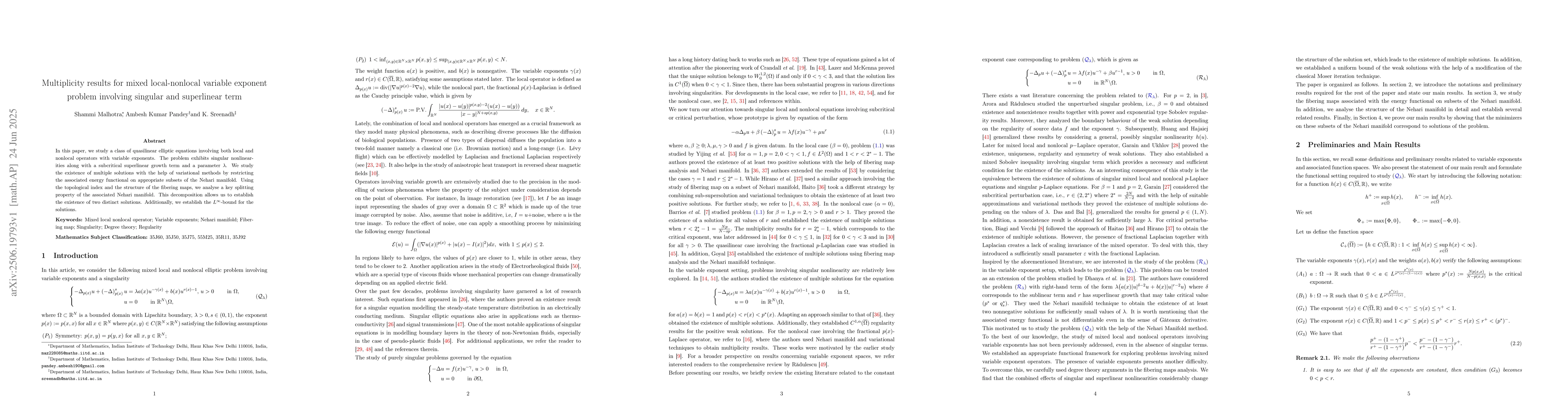 In this paper, we study a class of quasilinear elliptic equations involving both local and nonlocal operators with variable exponents. The problem exhibits singular nonlinearities along with a subcritical superlinear growth term and a parameter $\lambda$. We study the existence of multiple solutions with the help of variational methods by restricting the associated energy functional on appropriate subsets of the Nehari manifold. Using the topological index and the structure of the fibering maps, we analyse a key splitting property of the associated Nehari manifold. This decomposition allows us to establish the existence of two distinct solutions. Additionally, we establish the $L^\infty$-bound for the solutions.