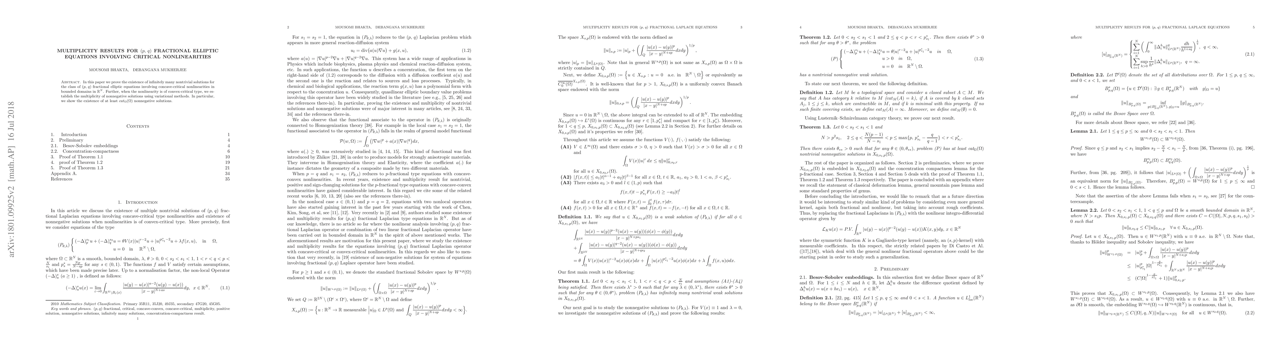 In this paper we prove the existence of infinitely many nontrivial solutions for the class of $(p,\, q)$ fractional elliptic equations involving concave-critical nonlinearities in bounded domains in $\mathbb{R}^N$. Further, when the nonlinearity is of convex-critical type, we establish the multiplicity of nonnegative solutions using variational methods. In particular, we show the existence of at least $cat_{\Omega}(\Omega)$ nonnegative solutions.
