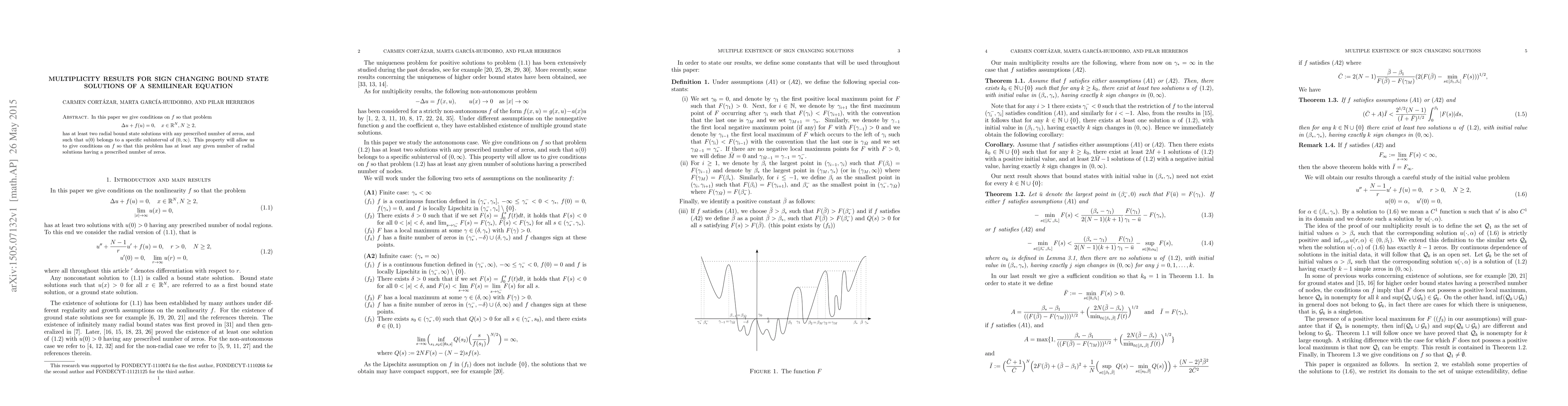A semilinear equation is analyzed for existence of at least two radial bound state solutions with specific properties, under conditions on the function f.