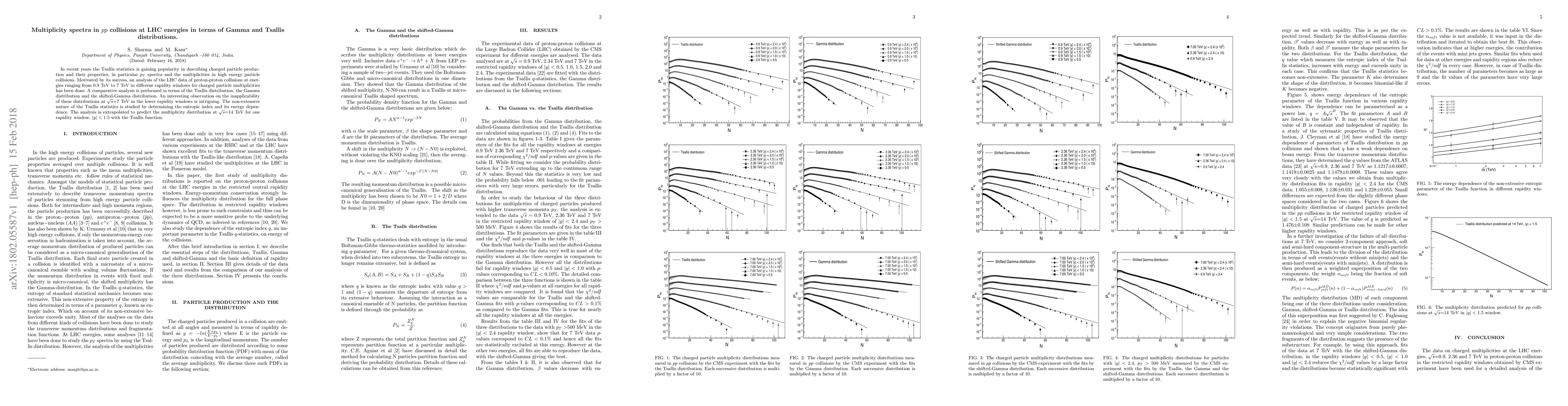 This paper analyzes proton-proton collision data from the LHC at energies from 0.9 TeV to 7 TeV using Tsallis and Gamma distributions to describe charged particle multiplicities. It finds that these distributions fail at 7 TeV in lower rapidity windows, highlighting the non-extensive nature of Tsallis statistics and predicting multiplicity distributions at 14 TeV.