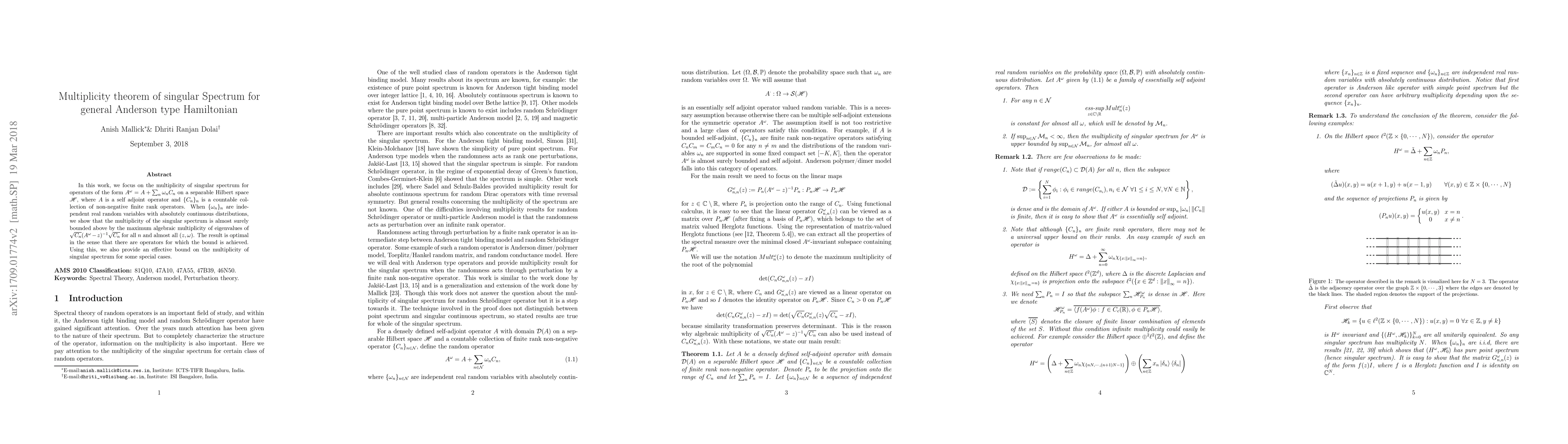A research paper establishes a bound on the multiplicity of singular spectrum for certain operators, showing it is almost surely bounded above by the maximum algebraic multiplicity of eigenvalues of a related expression.