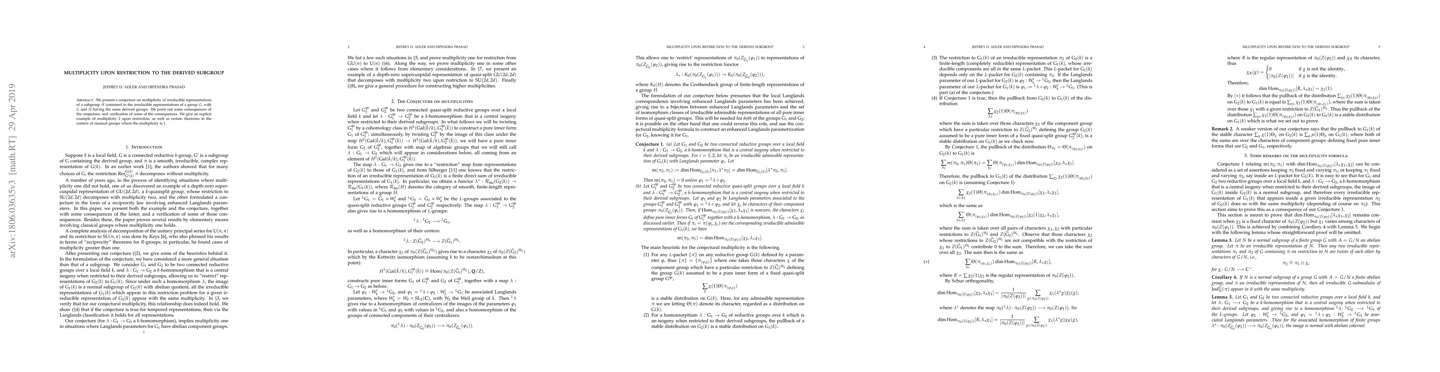 We present a conjecture on multiplicity of irreducible representations of a subgroup $H$ contained in the irreducible representations of a group $G$, with $G$ and $H$ having the same derived groups. We point out some consequences of the conjecture, and verification of some of the consequences. We give an explicit example of multiplicity $2$ upon restriction, as well as certain theorems in the context of classical groups where the multiplicity is $1$.