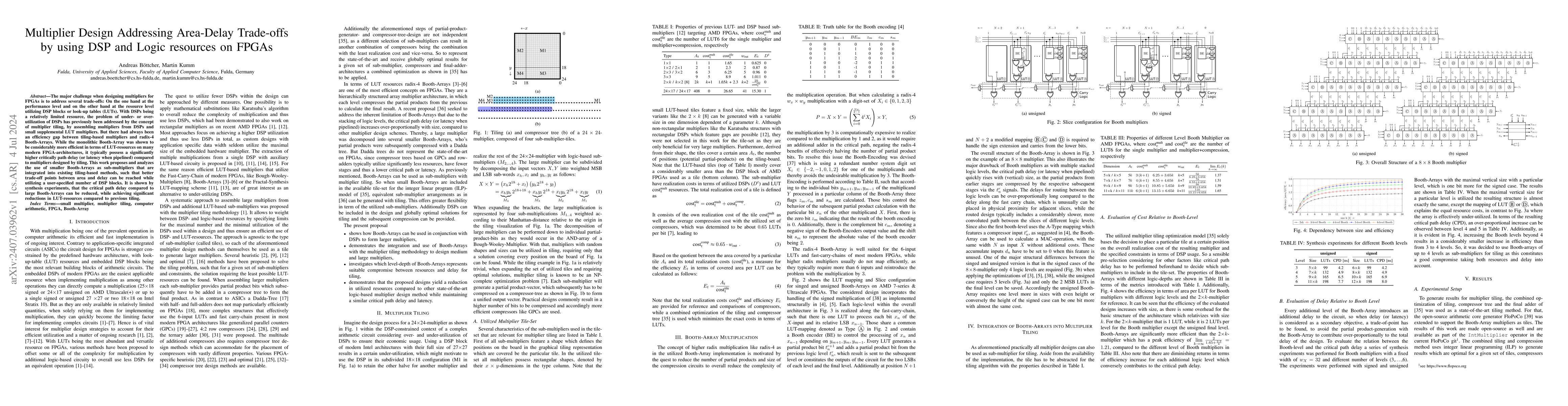 This paper proposes an innovative multiplier design for FPGAs that integrates smaller Booth-Arrays as sub-multipliers into tiling-based methods, aiming to achieve better area-delay trade-offs by optimizing the use of DSP blocks and LUTs. Experimental results demonstrate reduced critical path delays and significant reductions in LUT usage compared to traditional methods.