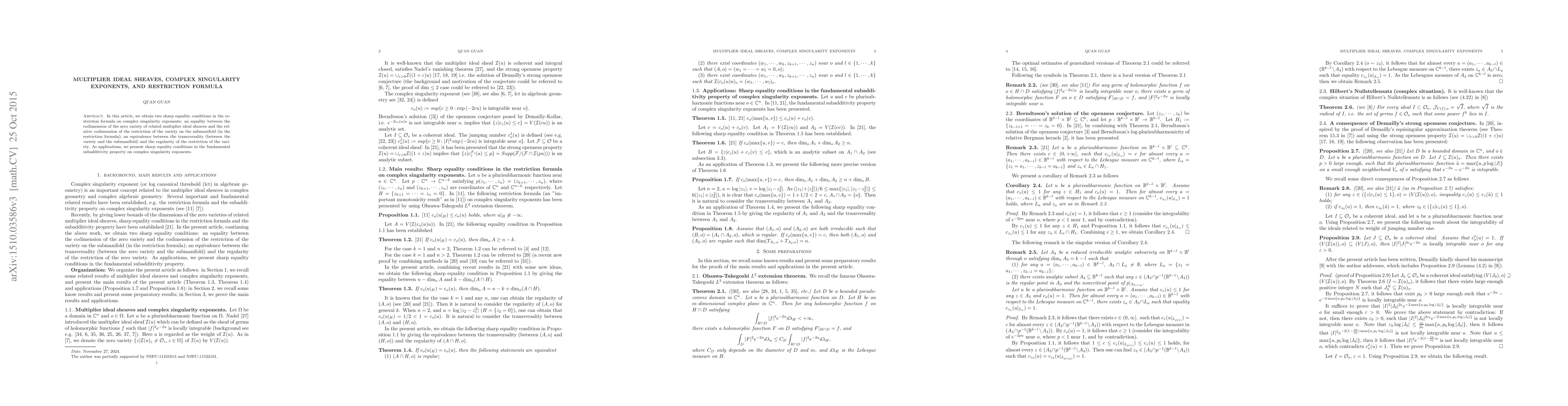 This paper establishes two key equality conditions in the restriction formula for complex singularity exponents, relating the codimension of multiplier ideal sheaves to the relative codimension of their varieties, and linking transversality with the regularity of restrictions. Applications demonstrate sharp conditions in the subadditivity property of these exponents.