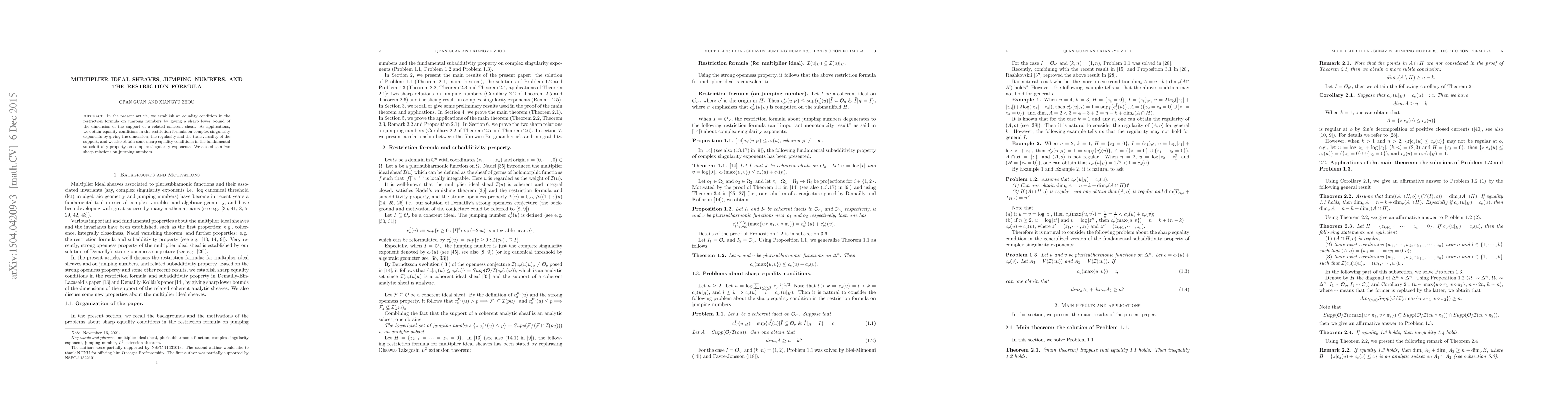 This paper establishes an equality condition in the restriction formula for jumping numbers by determining a precise lower bound for the dimension of the support of a related coherent sheaf. It also provides sharp conditions for complex singularity exponents, along with two sharp relations on jumping numbers.